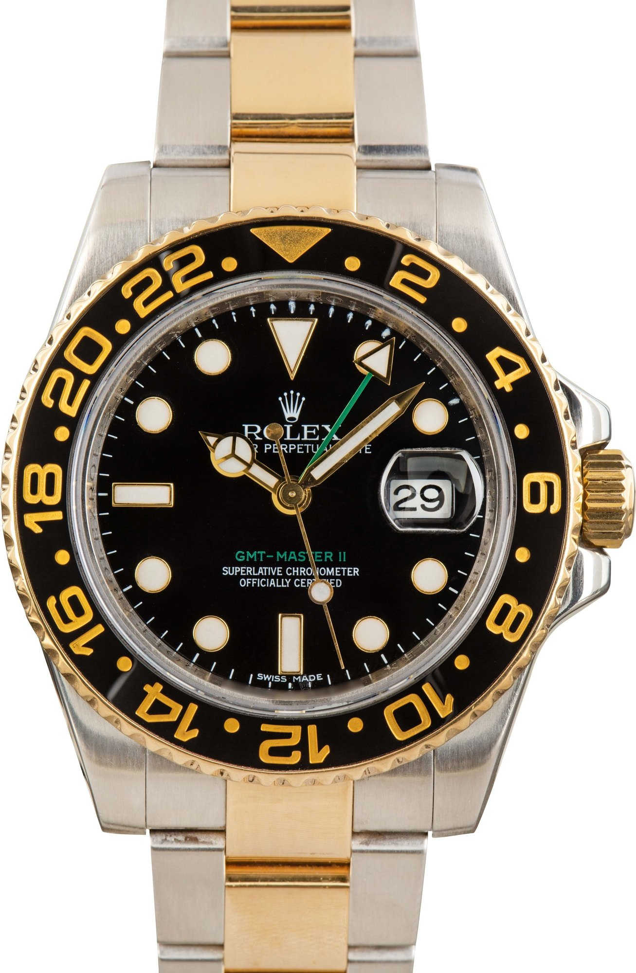 This Rolex GMT-Master II ref 116713 (2008 – 2009) features a luxurious 40mm stainless steel and 18k yellow gold case, a striking black bezel, and a versatile dual-time zone function, exemplifying Rolex’s blend of elegance and practicality.