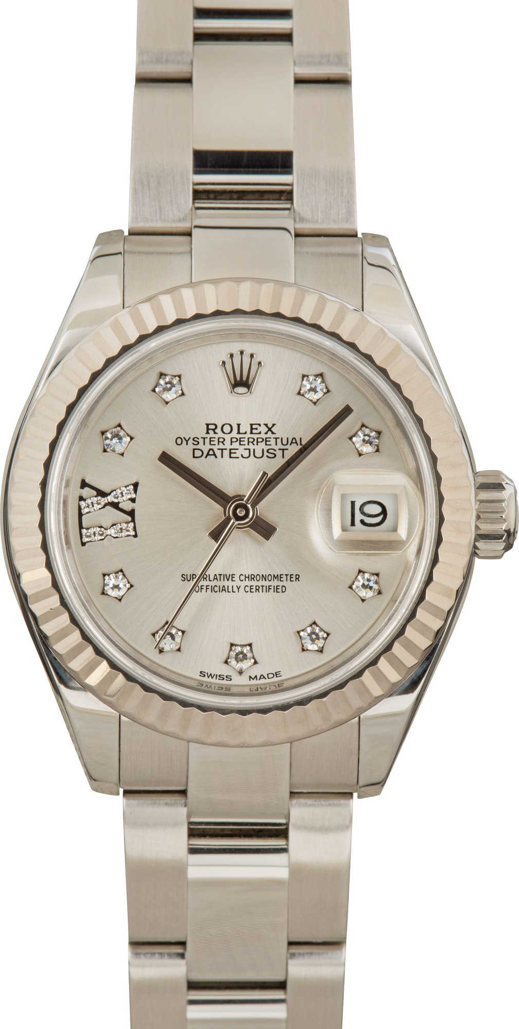 This 2024 Ladies Datejust ref. 279174 exudes elegance with a silver dial featuring diamond hour markers, including a diamond-set IX and star accents surrounding the other diamonds. Framed by a fluted bezel and paired with a classic Oyster bracelet, this 28mm timepiece combines luxury and refined style. Powered by a reliable automatic movement, it is a sophisticated choice for collectors seeking a modern Datejust with standout diamond detailing.