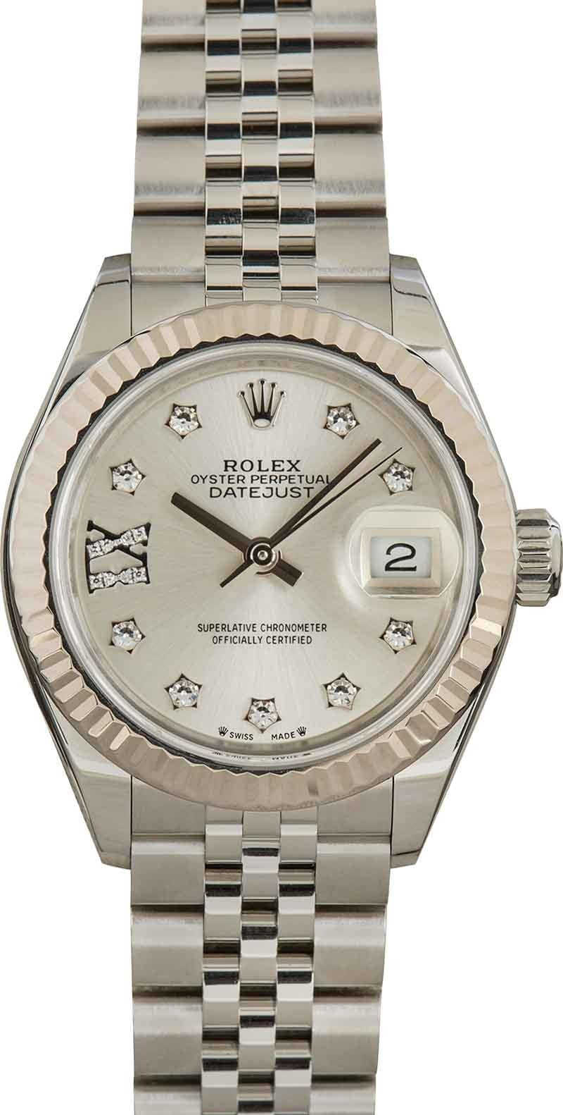 This 2021 Ladies Datejust ref. 279174 shines with a silver dial adorned with sparkling diamond hour markers, including a diamond-set IX and star-shaped accents around the remaining diamonds. A classic fluted bezel pairs elegantly with a polished Jubilee bracelet, giving the watch a sophisticated, timeless presence on the wrist. Powered by a precise automatic movement, this 28mm Datejust combines modern craftsmanship with luxurious detailing, making it a standout addition to any collection.