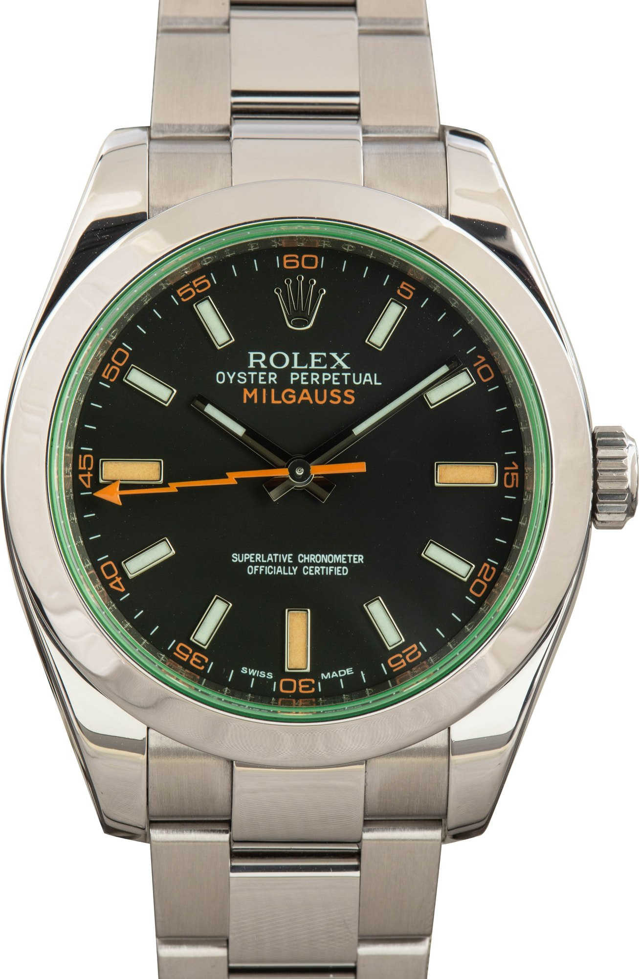 This Rolex Milgauss 116400 (2010) is a true standout with its striking black dial and unique green sapphire crystal. Its bold, anti-magnetic design and precision make it a top choice for both style and functionality.