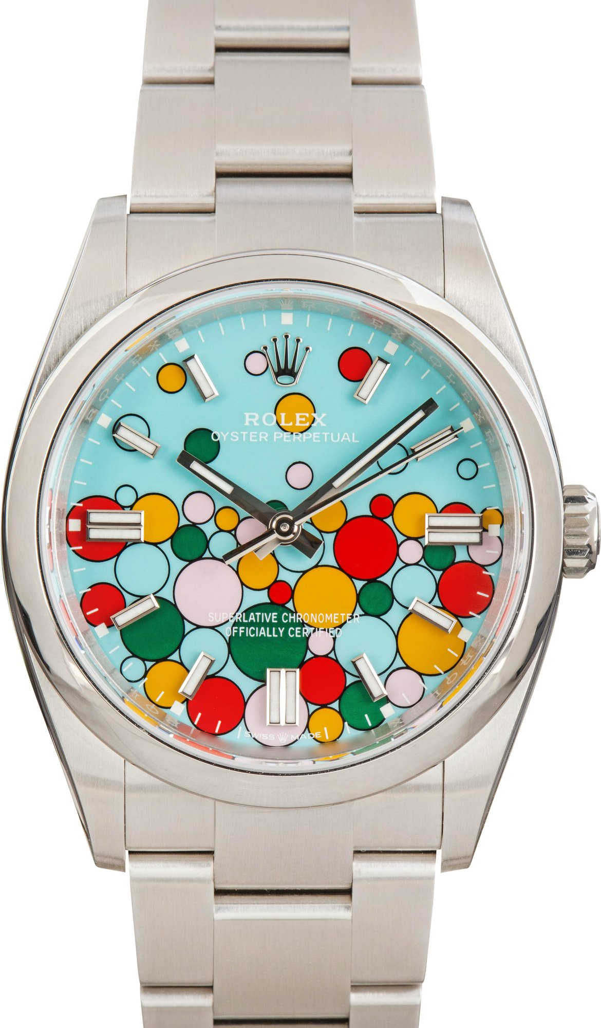 This Rolex Oyster Perpetual 36 ref 126000 (2023) brings a fresh burst of energy to a classic design. Imagine glancing at your wrist and catching the playful colors of the Celebration Motif dial—it’s an instant mood-lifter. The 36mm stainless steel case strikes the perfect balance between elegance and durability, making it versatile enough for any occasion. With the iconic Oyster band wrapping comfortably around your wrist, this watch isn’t just a timekeeper; it’s a statement piece that adds a touch of joy to your everyday style.