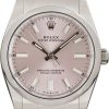 Rolex Oyster Perpetual 34 ref. 114200 (2019) features a 34mm stainless steel case with a smooth bezel and Oyster bracelet. The distinctive white grape dial adds a unique pop of color, while Rolex’s automatic movement delivers precision and reliability. A refined yet versatile timepiece that balances everyday wearability with timeless style.