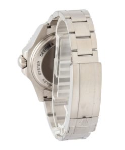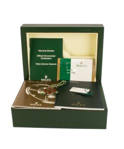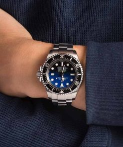 This Rolex Sea-Dweller Deepsea ref. 116660 (2017) features a 44mm stainless steel case with a titanium caseback and a black ceramic timing bezel. The deepblue chromalight dial with green “Deepsea” lettering offers excellent legibility in deep waters. It comes with an Oyster bracelet and is powered by the 3135 movement, designed for professional divers.