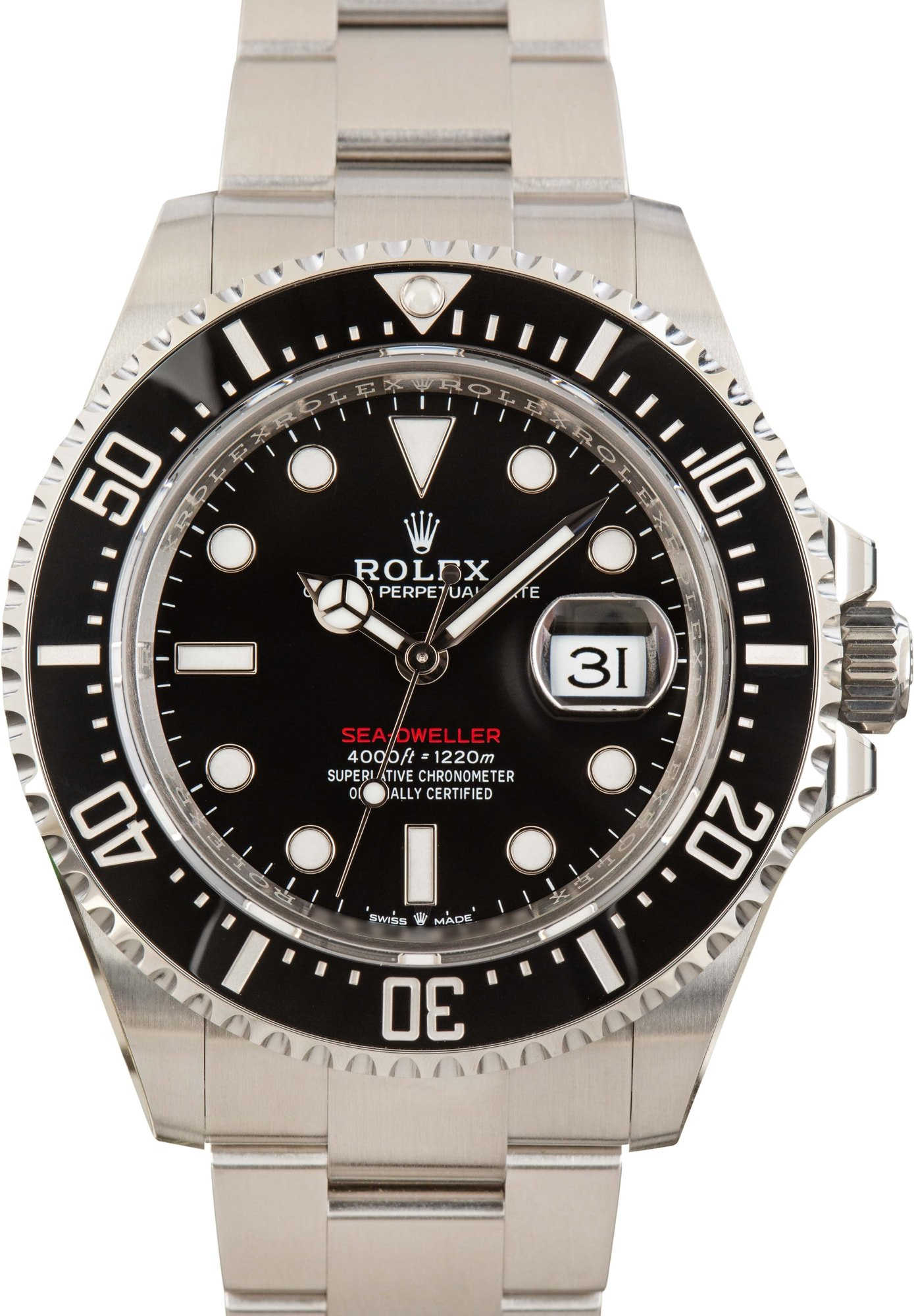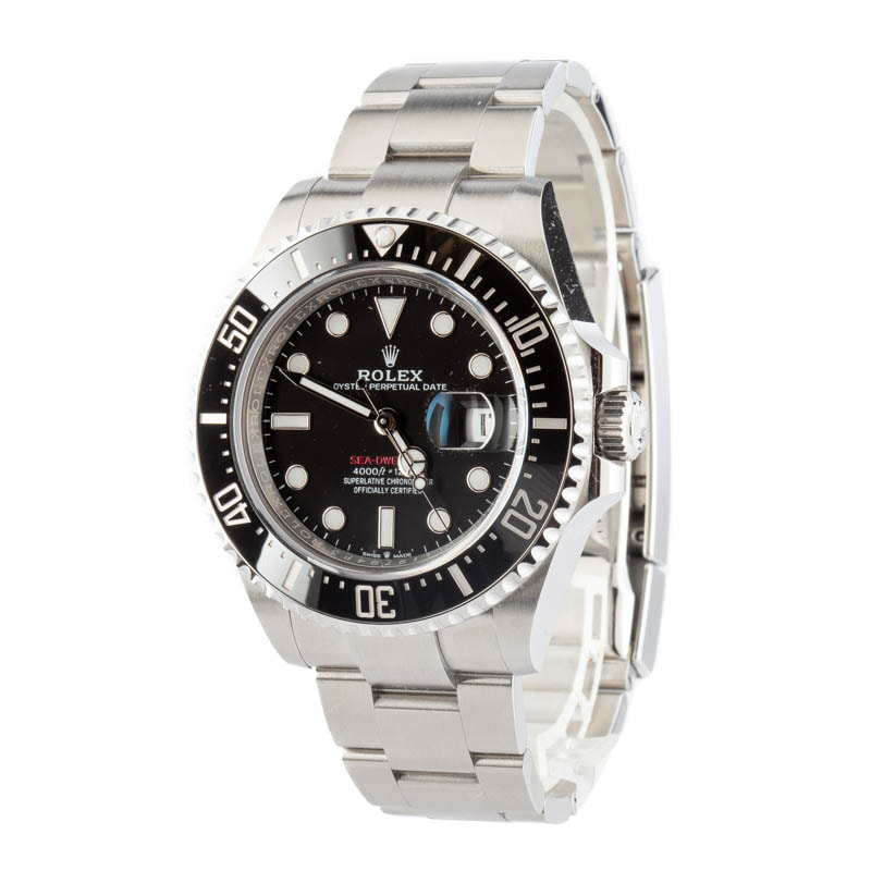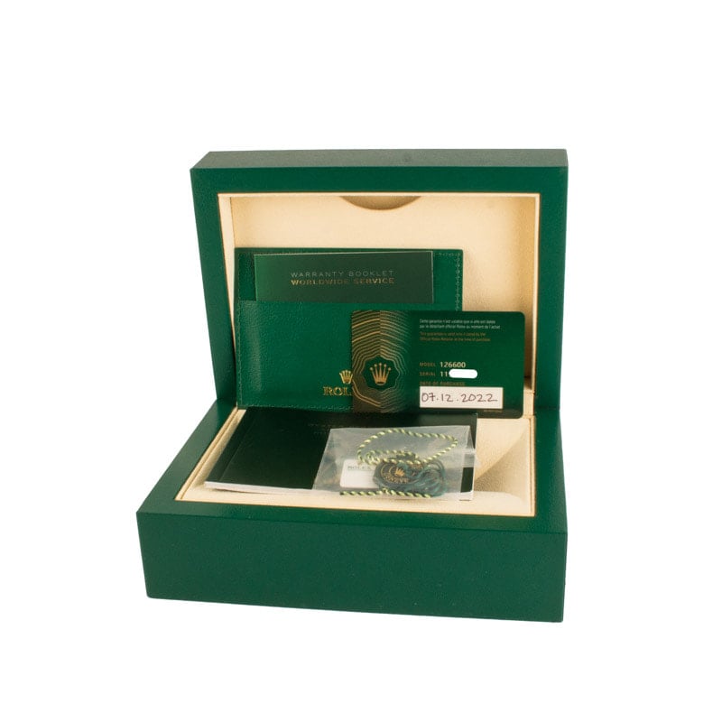 This Rolex Sea-Dweller ref. 126600 (2022) stands out with its bold 43mm stainless steel case and signature red lettering on a black Chromalight dial for maximum legibility. Designed for professional divers, it combines robust water resistance and Rolex’s modern Caliber 3235 movement with a sleek, refined design. Rugged yet sophisticated, this Sea-Dweller embodies Rolex heritage while delivering the performance and presence needed for any adventure.