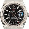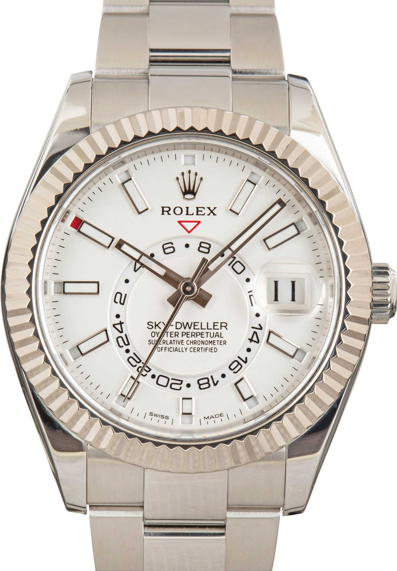 This Rolex Sky-Dweller ref. 326934 blends bold design with travel-ready innovation. Its stainless steel case and 18k white gold fluted bezel frame a crisp white dial with luminous markers and dual-time display. Powered by Caliber 9001, it offers an annual calendar, GMT function, and 72-hour power reserve—precision and presence for every journey.