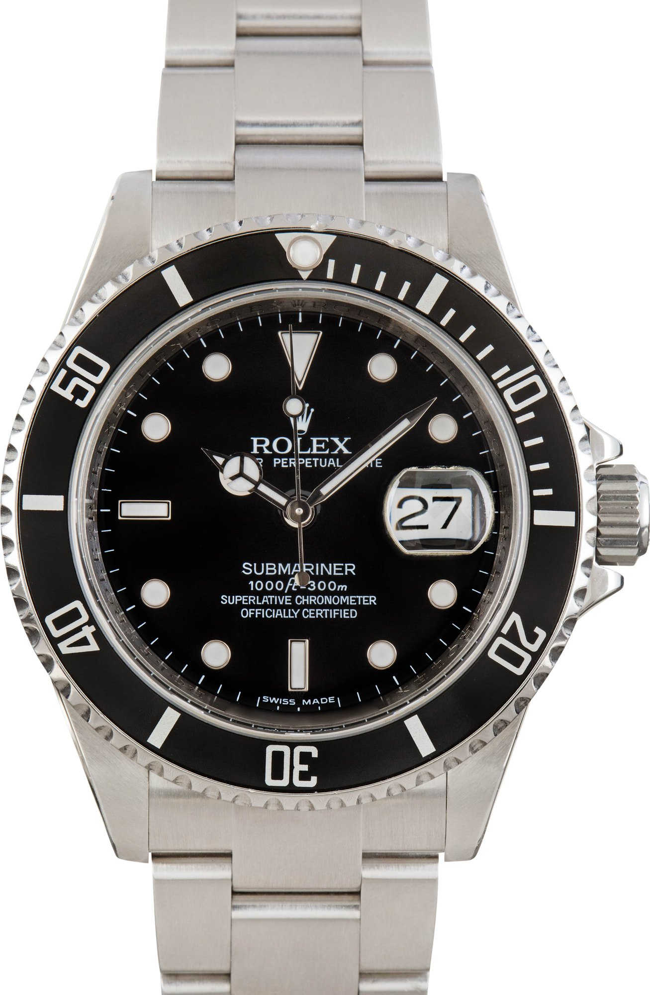 Rolex Submariner ref. 16610T (2008) features a 40mm stainless steel case with a smooth “no holes” design and a serial-number engraved rehaut. The black Superluminova dial ensures exceptional legibility, paired with a unidirectional rotating bezel and water resistance to 300 meters. Powered by the calibre 3135 automatic movement, this Submariner combines classic dive watch functionality with refined modern touches.