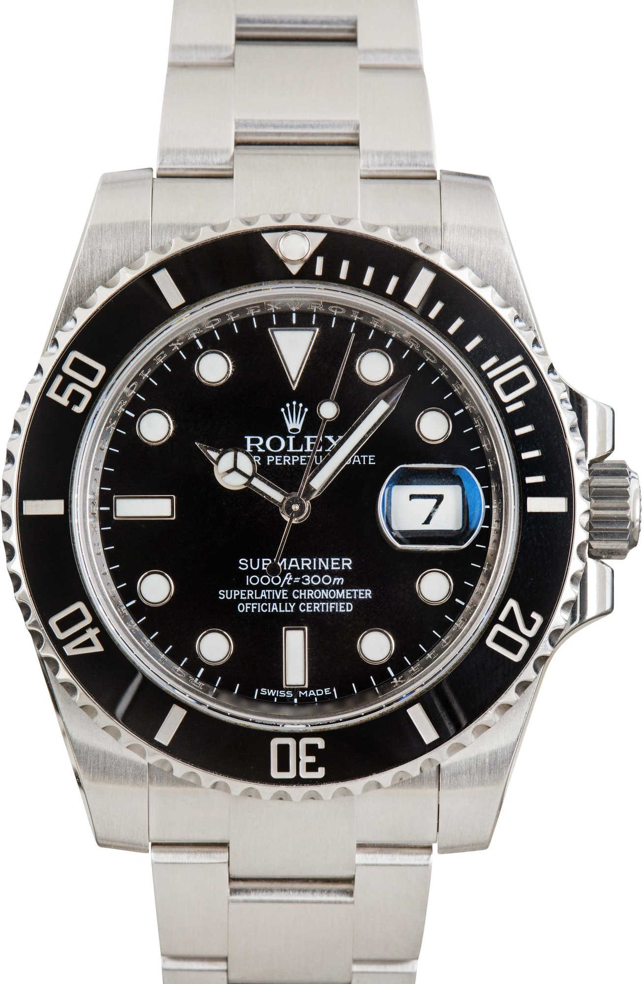 This Rolex Submariner ref. 116610 (2011 – 2020) features a 40mm Oystersteel case with a black dial, Chromalight hands and hour markers, and a scratch-resistant black Cerachrom unidirectional bezel for precise dive-time tracking. Powered by this COSC-certified Caliber 3135 automatic movement with 48-hour power reserve, it delivers reliable performance for both underwater and everyday wear. Completing this iconic dive watch is this Oyster bracelet with Oysterlock clasp and Glidelock extension system, along with a Triplock screw-down crown and 300m (1,000ft) water resistance for exceptional durability and versatility.