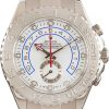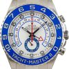 This Rolex Yacht-Master II ref 116681 (2011 – 2024) features a striking white index dial and a bold blue ceramic bezel, set in a luxurious two-tone Oyster case combining Everose gold and stainless steel. Powered by the Caliber 4161 movement, it blends elegant design with advanced regatta timing functionality.