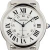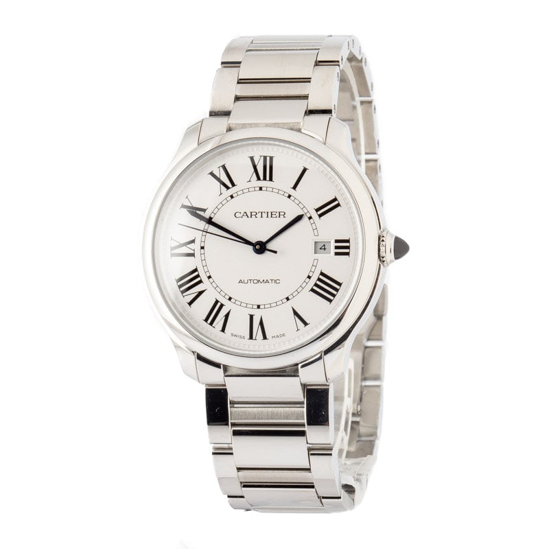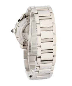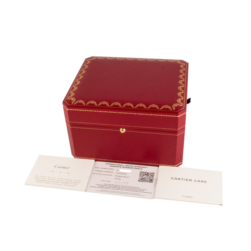 Ronde Must de Cartier ref WSRN0035 (2023) combines classic Cartier design with modern functionality. This 40mm timepiece features a steel case with a beaded crown set with a synthetic cabochon-shaped spinel, a sandblasted silver dial, and blued-steel sword-shaped hands under a scratch-resistant sapphire crystal. Powered by Cartier’s automatic Caliber 1847 MC, it comes with a steel strap equipped with an interchangeability system for versatile wear. Measuring 9.62mm in thickness and water-resistant to 3 bar (30 meters / 100 feet), this Ronde Must de Cartier balances elegance and practicality.