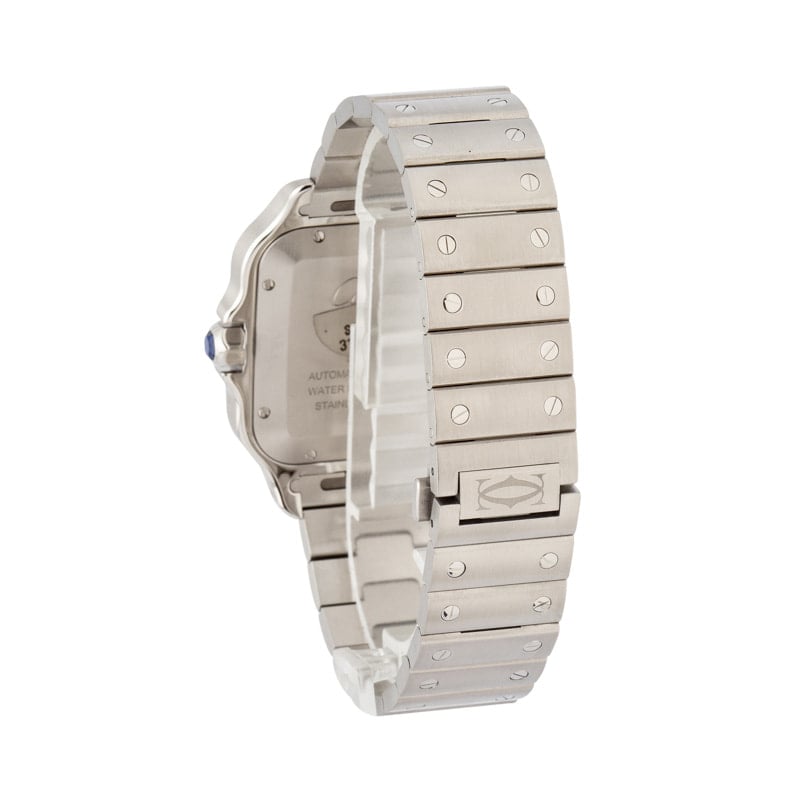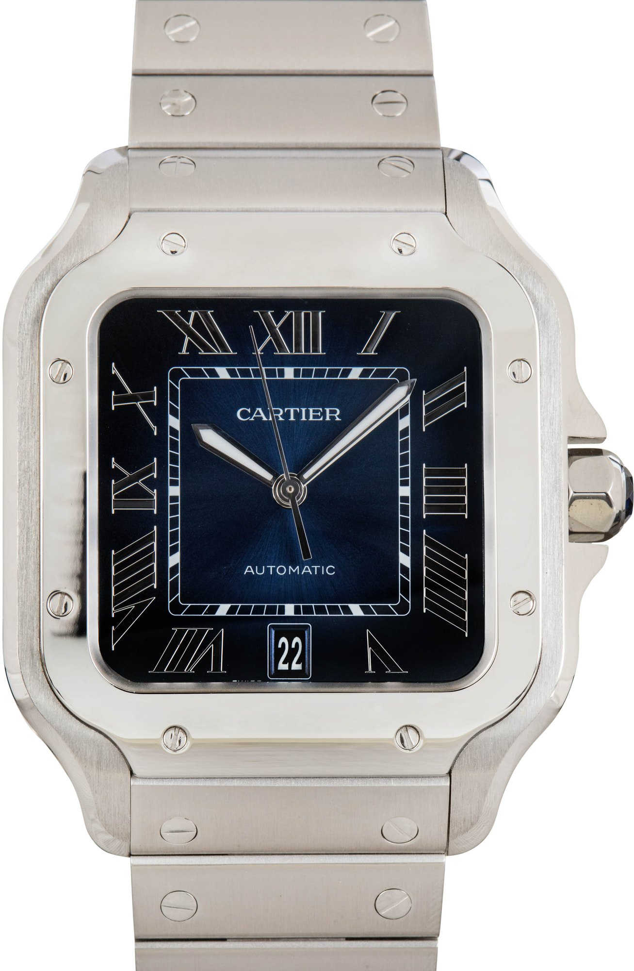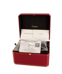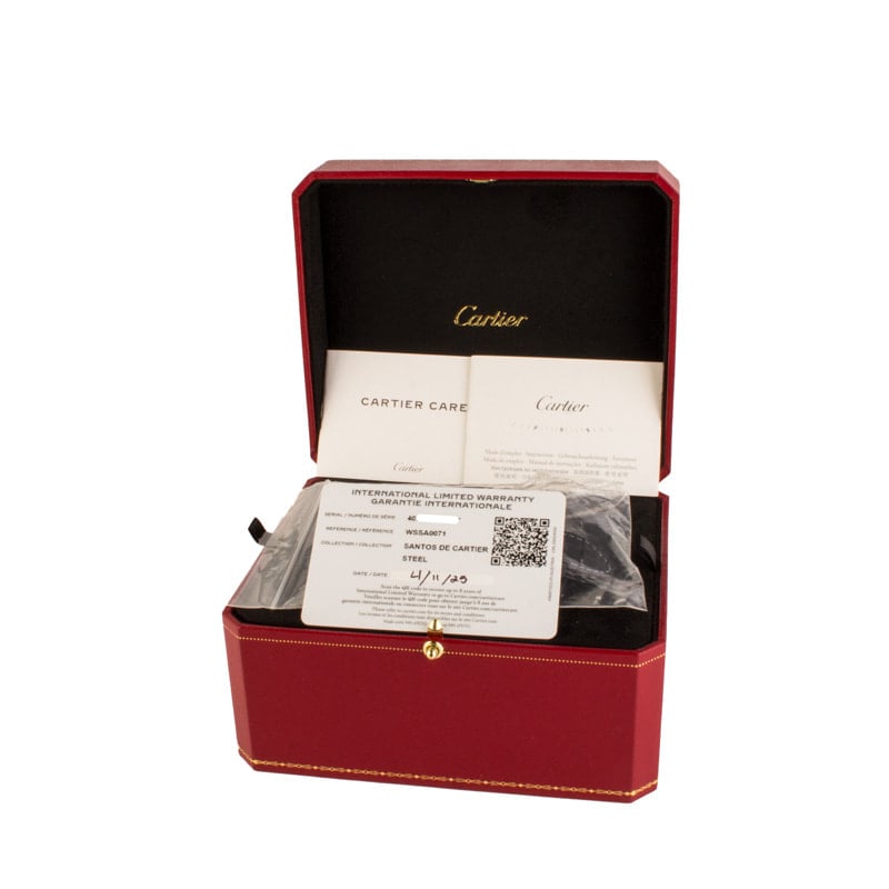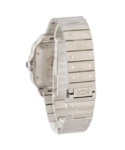 This Santos de Cartier WSSA0071 (2025) delivers a modern take on Cartier’s signature squared aesthetic, housed in a sleek 39.8mm stainless steel case just 9.38mm thick. Its graduated blue dial is complemented by polished steel sword-shaped hands with luminous fill and protected by a sapphire crystal. A seven-sided crown set with a synthetic faceted blue spinel adds a refined touch. Powered by the automatic Caliber 1847 MC, this model includes a stainless steel bracelet with SmartLink quick adjustment and a blue leather strap for added versatility.