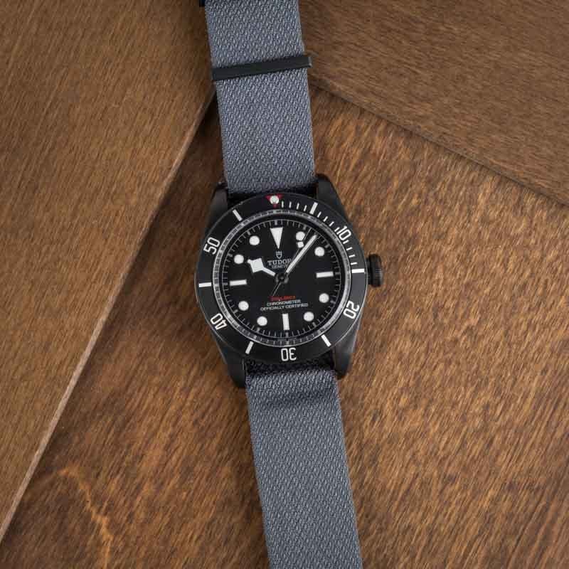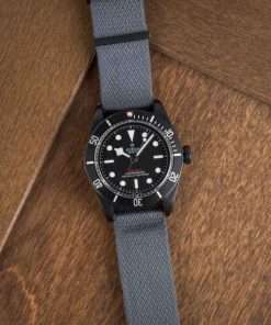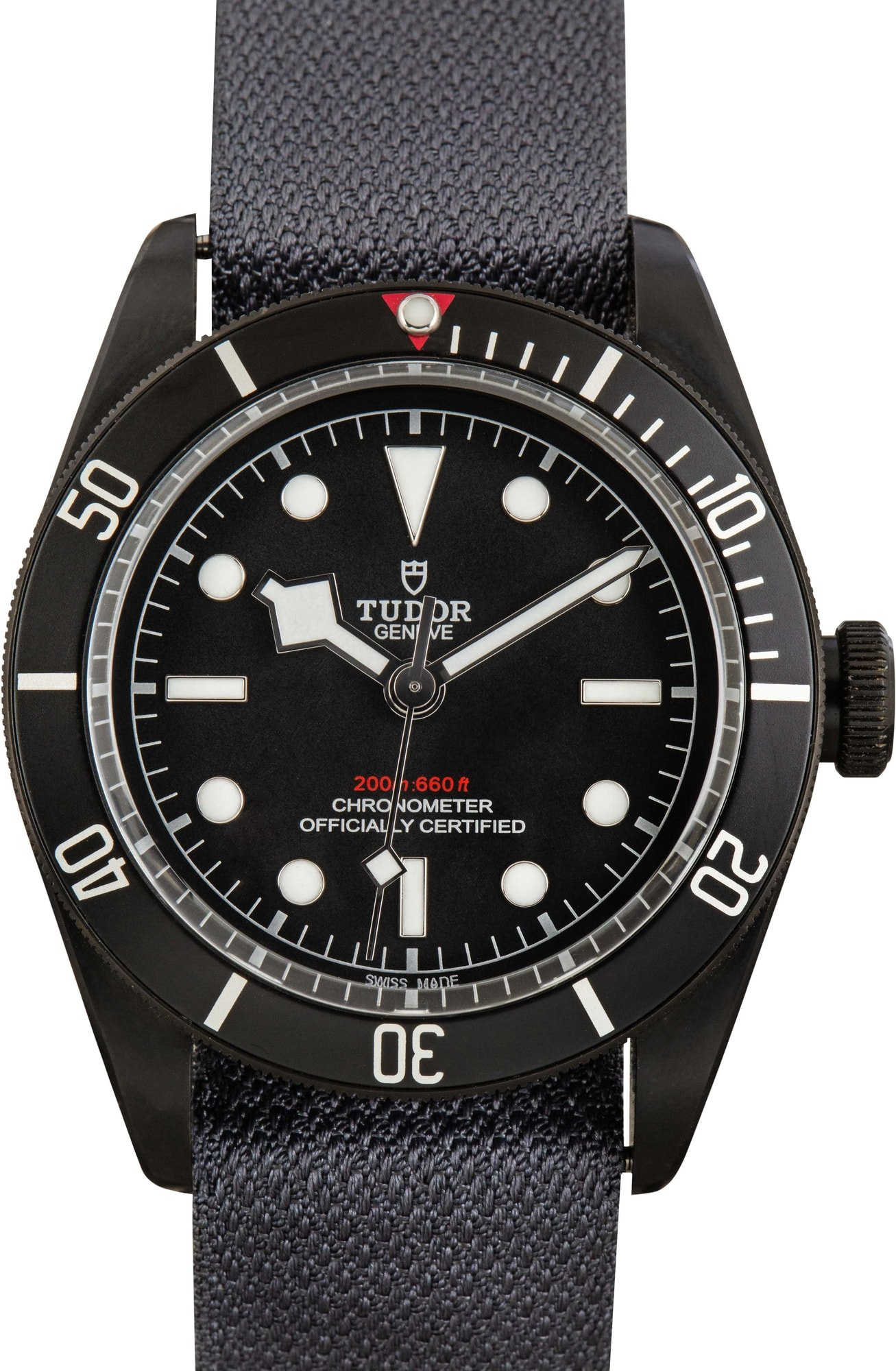 This Tudor Heritage Black Bay ref. 79230DK (2016–2021) features a 41mm black PVD-coated stainless steel case with a unidirectional timing bezel, giving it a bold and stealthy look. Its black luminous dial ensures strong legibility in low light, while the grey fabric strap adds a rugged, utilitarian touch. Powered by the in-house Tudor MY5602 automatic movement, it combines reliable performance with the iconic vintage-inspired styling of the Black Bay line.