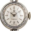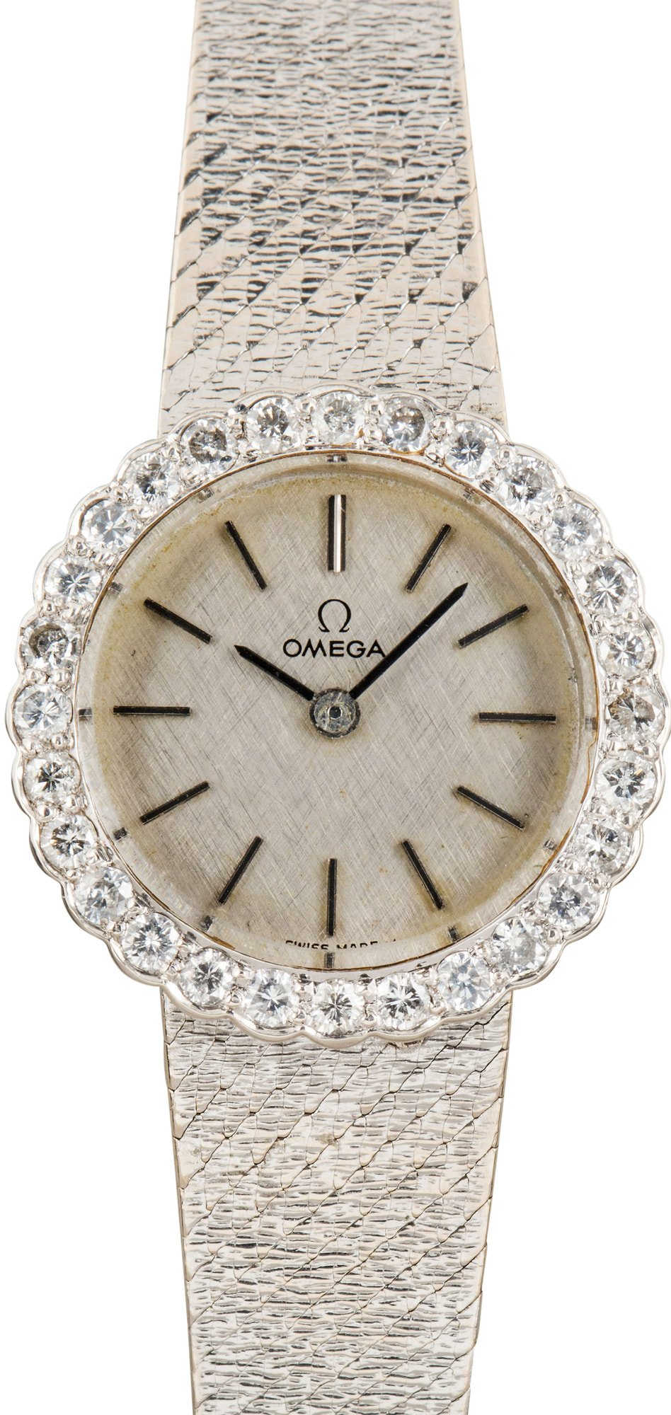 This vintage Omega cocktail watch presents a refined silver textured dial framed by an elegant diamond-set bezel. Crafted in the 1950s, this petite dress piece features a delicate profile with classic styling and timeless appeal. The bracelet fits up to a 7.25-inch wrist and includes a safety clasp for secure wear.
