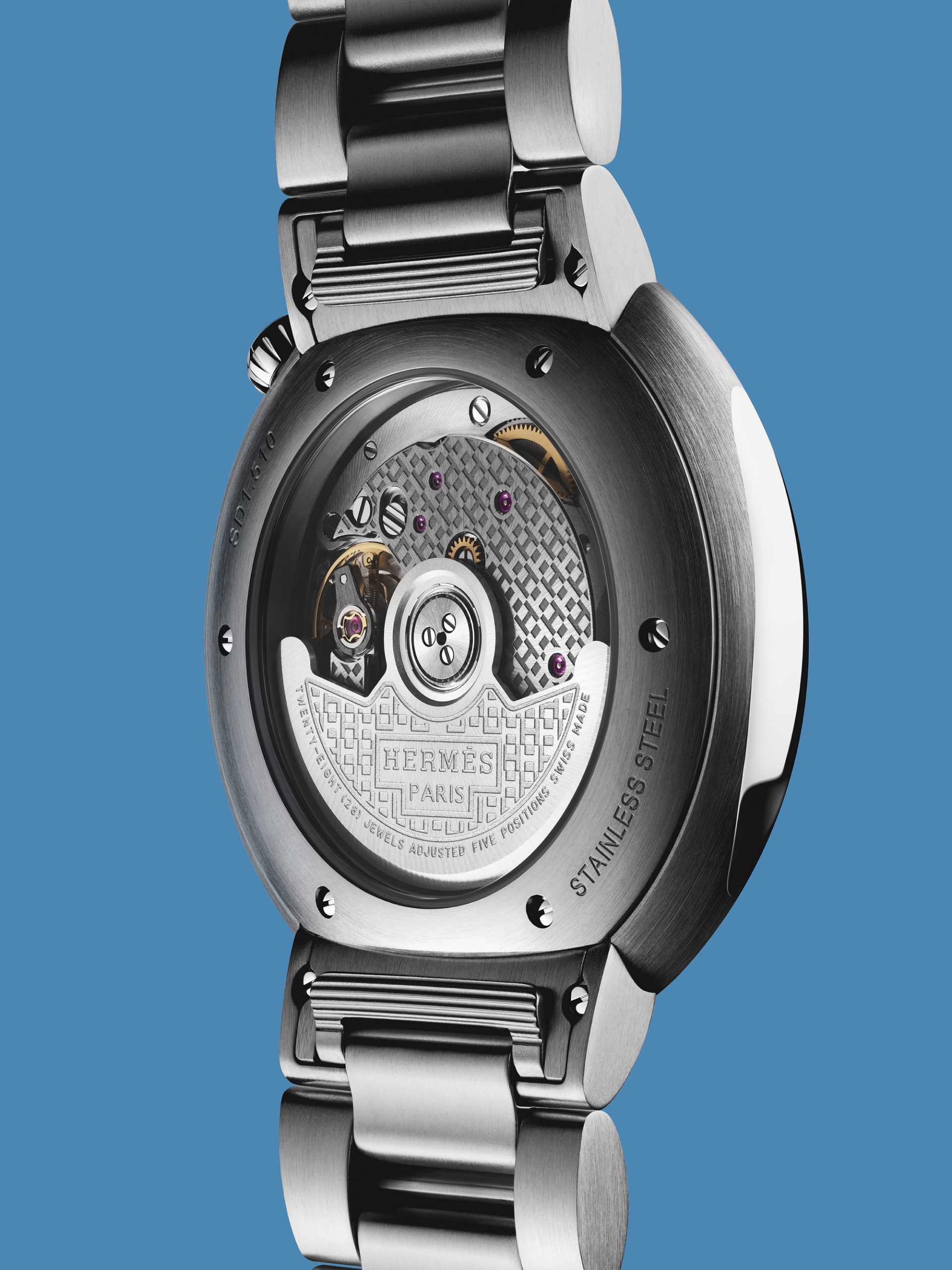 Powered by a Manufacture Hermès H1912 movement, the Hermès Cut displays hours, minutes, and seconds with elegant baton-shaped hands. The integrated metal bracelet is seamlessly designed with supple links that mirror the case’s aesthetics. Alternatively, a choice of a rubber strap is available in eight colors inspired by the Hermès palette, with an easy-to-use interchangeability system for daily style variation.