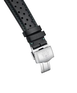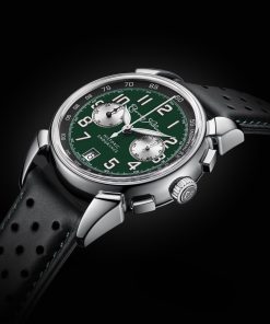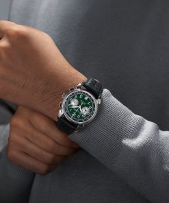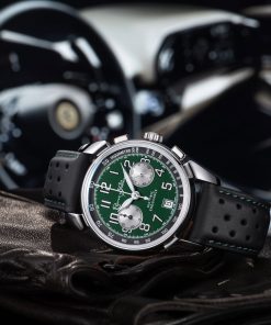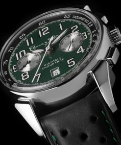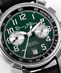 The Historiador Historic Endurance pays homage to motorsport history with its green and silver dial, inspired by the Gordon Bennett Cup of 1900, where car colors were determined by nationality. The watch’s design includes leaf-shaped hour and minute hands, a black 30-minute counter hand, and a tachymeter scale against a black background. The word “Taquimetro” on the dial pays tribute to the race’s origins.