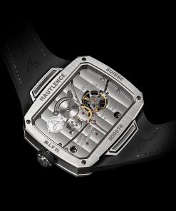 Inspired by locomotives, the HLXX’s intricate lever system orchestrates the synchronized movement of the retrograde minutes hand and jumping-hour mechanism. Globolight® numerals on a tinted sapphire minutes track add a contemporary flair, while a rotating Möbius logo reminds us of time’s fleeting nature.