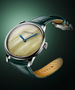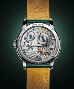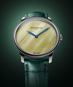 Sourcing this rare material was no small feat. Arnold & Son carefully selected a 1.6-kilogram block, formed over 30 million years, knowing the treasure within was a mystery until the first cut. Only the finest, most structurally sound amber made the cut, revealing luminous honeyed hues that shift and deepen with light. The result is a dial that glows with golden depth, subtly complemented by an ‘imperial green’ alligator strap.