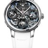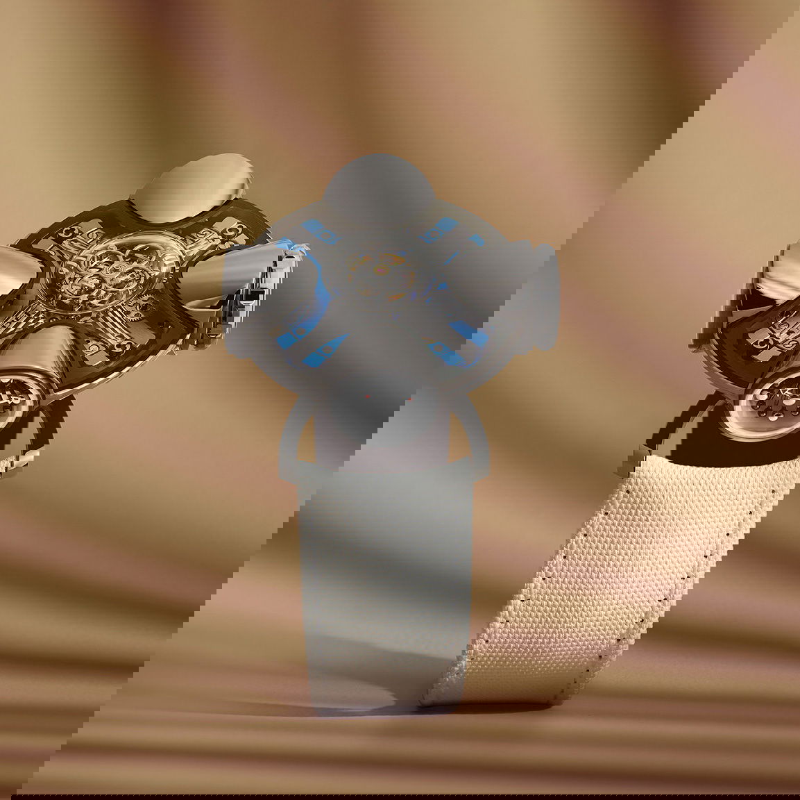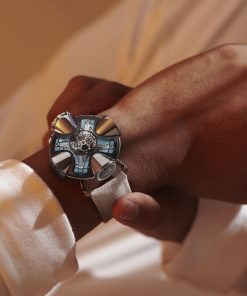 At its heart lies a central flying tourbillon, a beacon within a sapphire crystal dome, akin to the most sacred of spaces, radiating time with a celestial cadence. Four unique chambers extend from this core, each serving a specific purpose: telling time, indicating power reserve, measuring temperature, and setting the time. The dynamic structure can be turned, and with each rotation, it not only alters its display but also winds the watch, a feature that showcases the brand’s innovative approach to horology.
