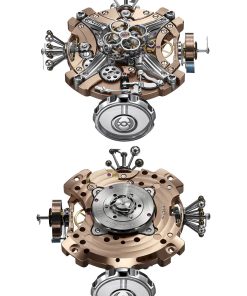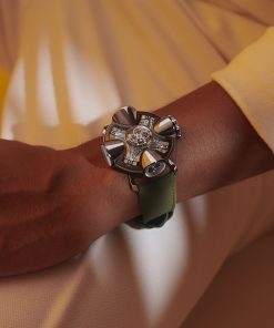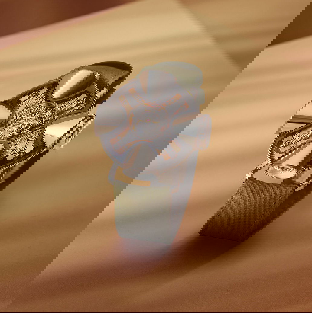 At its heart lies a central flying tourbillon, a beacon within a sapphire crystal dome, akin to the most sacred of spaces, radiating time with a celestial cadence. Four unique chambers extend from this core, each serving a specific purpose: telling time, indicating power reserve, measuring temperature, and setting the time. The dynamic structure can be turned, and with each rotation, it not only alters its display but also winds the watch, a feature that showcases the brand’s innovative approach to horology.