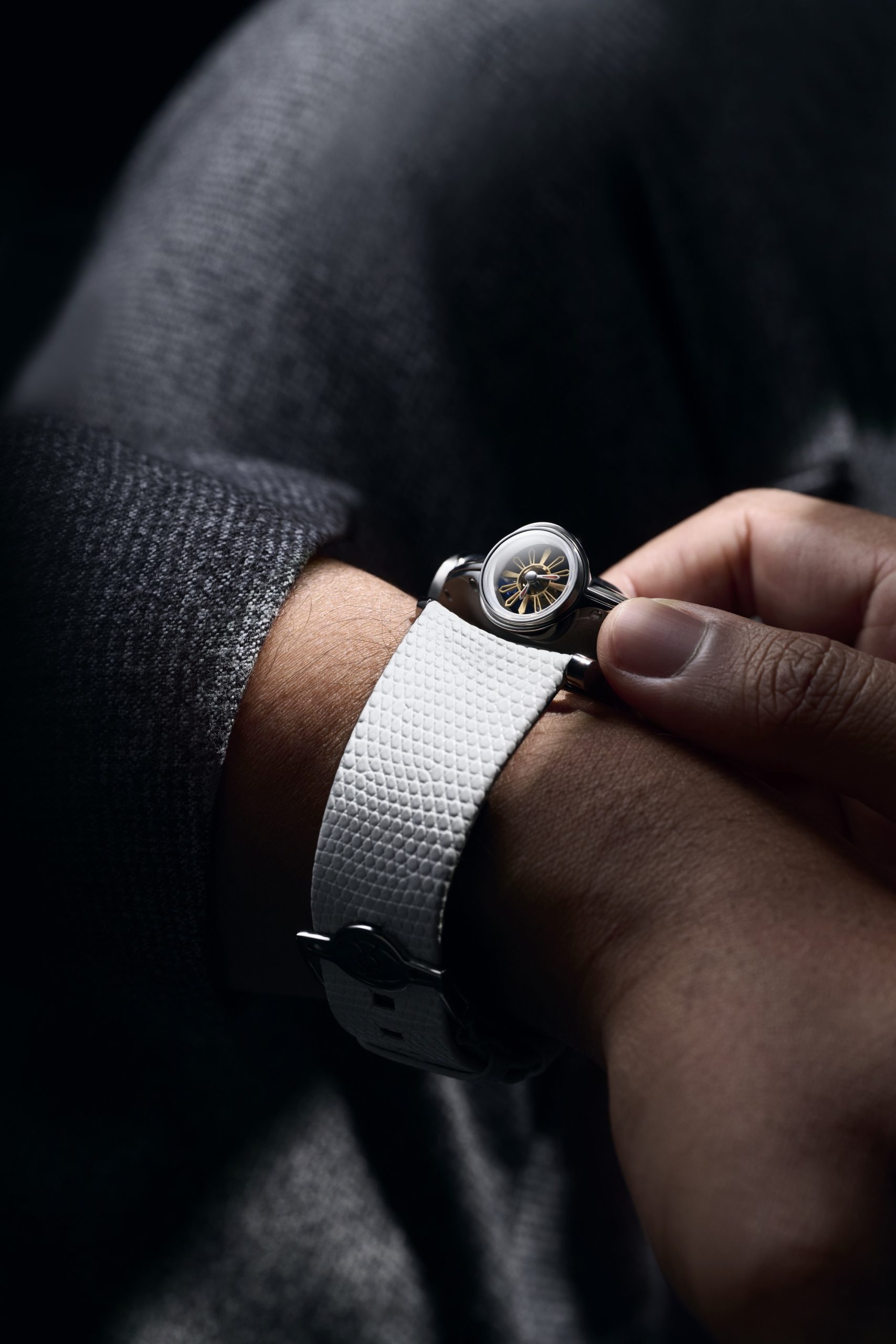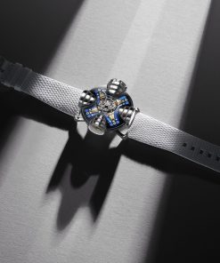 Both share the same movement: a 2.5 Hz in-house calibre suspended on four tensioned springs and wound by rotating the case. Sapphire covers each display, water-resistance remains 20 metres, and comfort is improved by curved strap-integrated lugs. The Art Deco editions come in two runs of ten pieces, blue with yellow-gold toned bridges, or green with rose-gold. Each is finished with sharp angles, translucent enamel hands and detailed alternating surfaces.