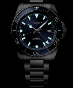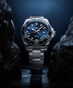 HydroConquest watches merge high performance with elegance, catering to those who thrive on challenging boundaries and seeking new experiences. This 43 mm-diameter variation hosts the exclusive Longines GMT calibre L844.5, featuring a silicon balance-spring and innovative components crafted from non-magnetic materials. The movement’s resistance to magnetic fields exceeds the ISO 764 reference standard by more than tenfold, ensuring exceptional accuracy and a power reserve of up to 72 hours.