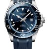Characteristic features of this timepiece, inspired by water sports, include a captivating blue sunray dial, a unidirectional rotating bezel crafted from blue ceramic, and exceptional water resistance up to 30 bar (300 meters), complemented by a screw-down crown and case back. The model offers a choice of either a stainless steel or blue rubber strap, both equipped with a double-safety folding clasp featuring micro-adjustment capabilities.
