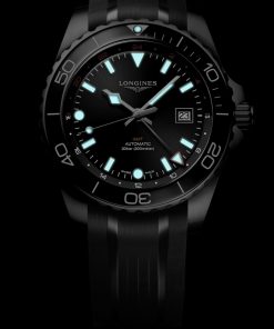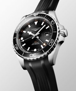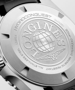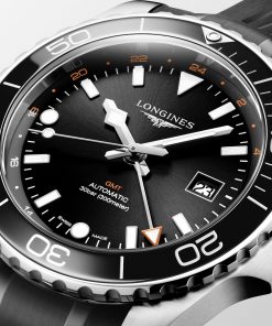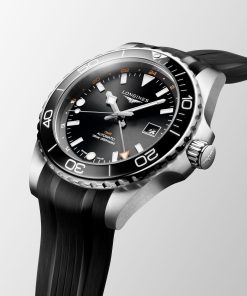 Characteristic features of the HydroConquest GMT, inspired by aquatic pursuits, include a sleek black sunray dial, a unidirectional rotating bezel made of black ceramic, and outstanding water resistance up to 30 bar (300 meters), along with a screw-in crown and screw-down case back. The model is available with either a stainless steel or black rubber strap, both equipped with a double-safety folding clasp featuring micro-adjustment functionality.