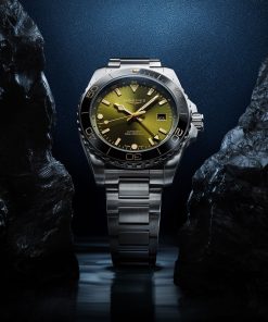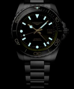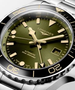 Distinctive elements of the HydroConquest GMT, inspired by aquatic endeavors, include a captivating green sunray dial, a black ceramic unidirectional rotating bezel, and exceptional water resistance up to 30 bar (300 meters). Further enhancing its functionality are a screw-in crown and screw-down back. Completing its design is a stainless steel bracelet with a double-safety folding clasp featuring micro-adjustment capabilities.