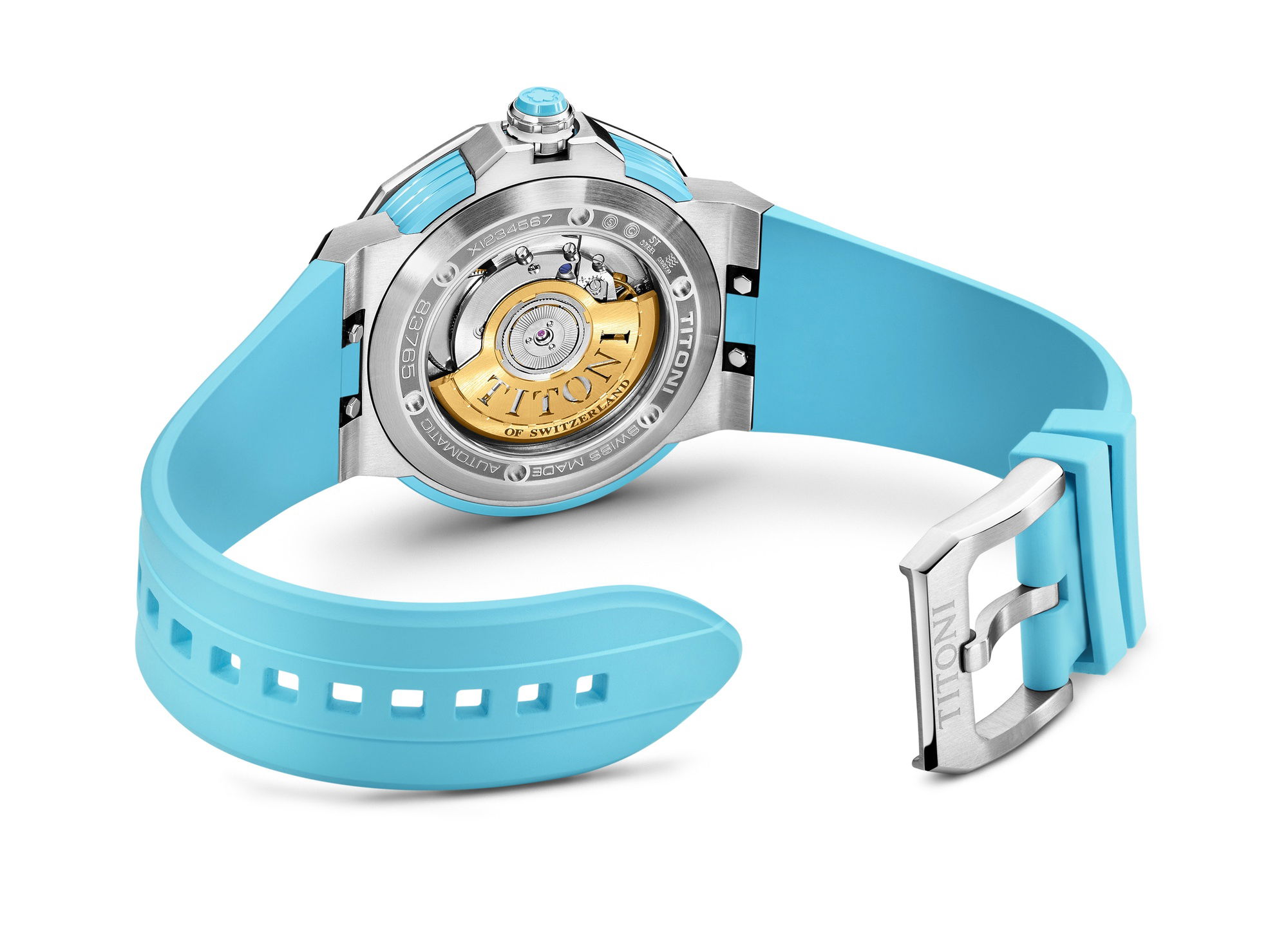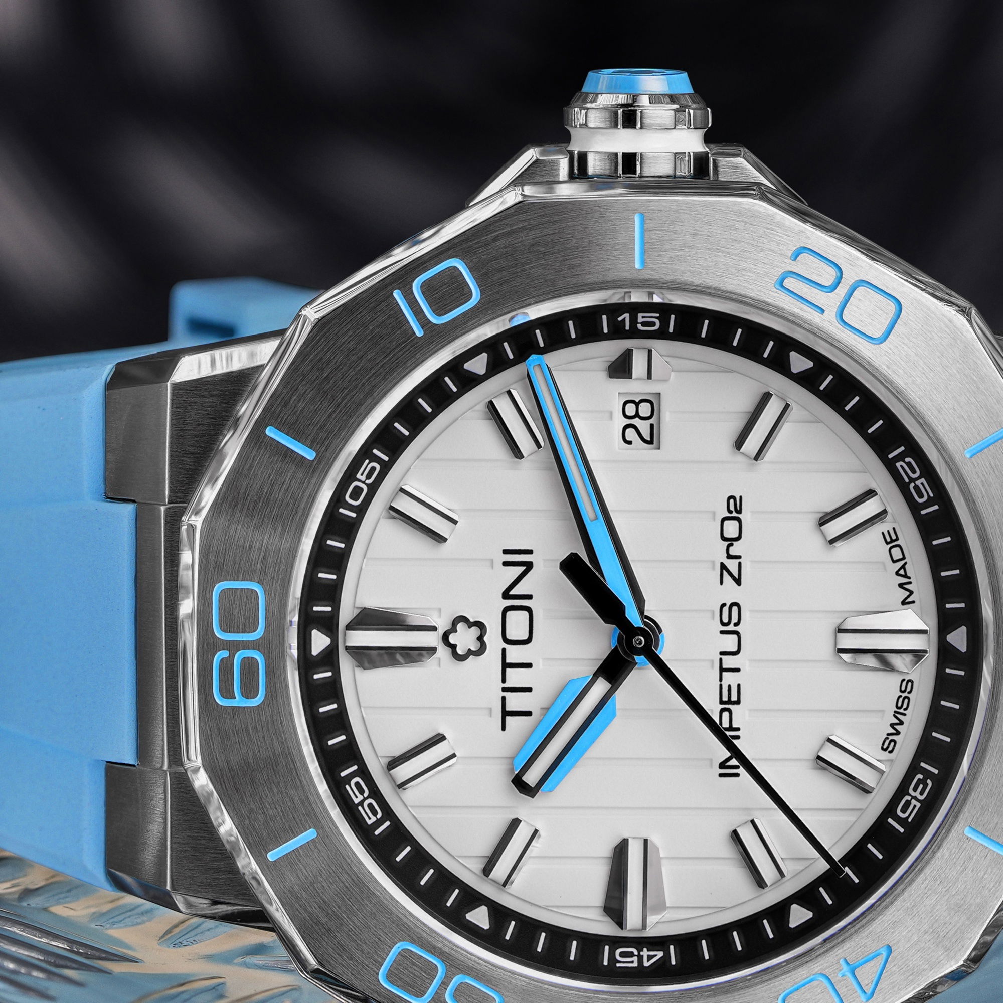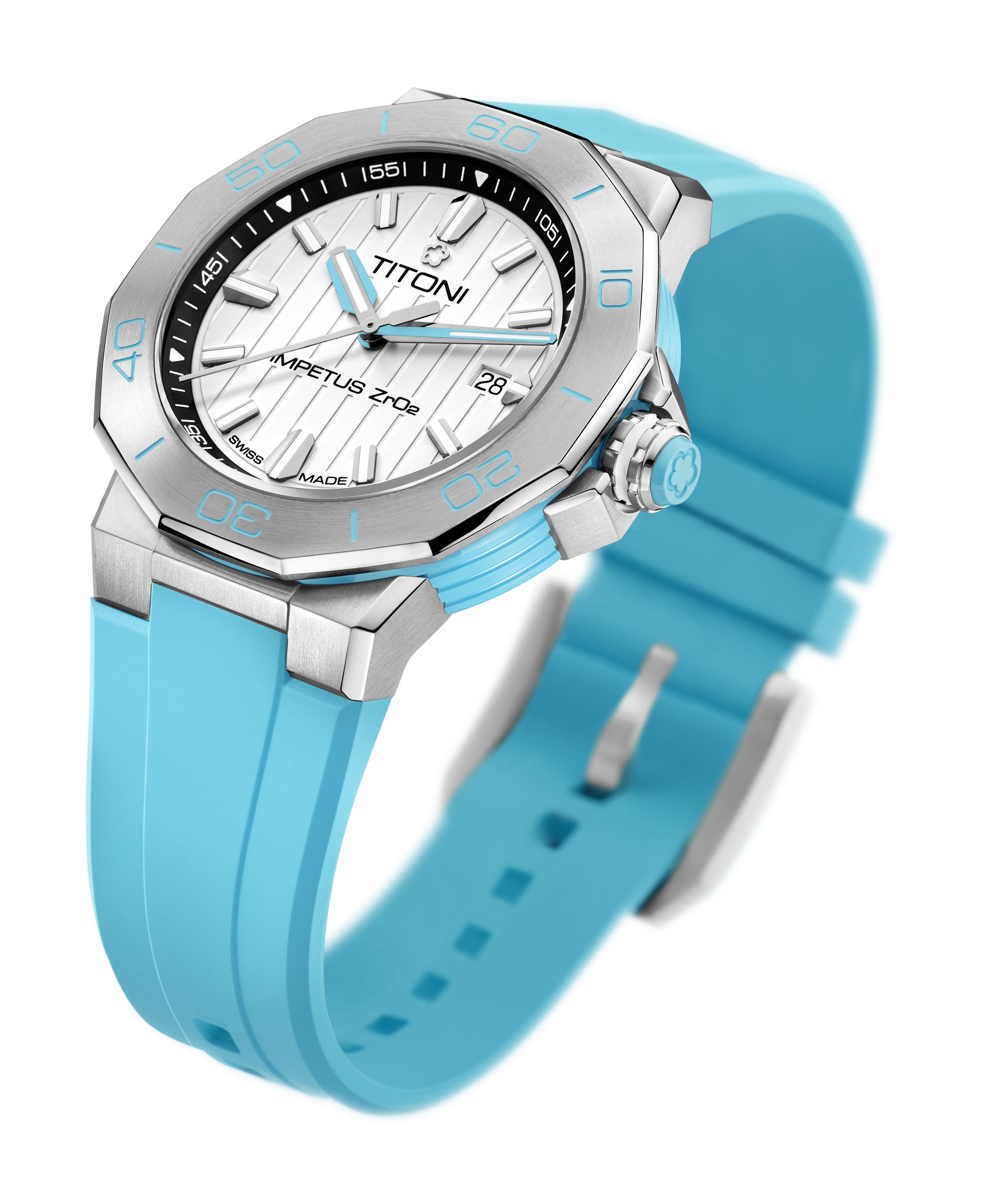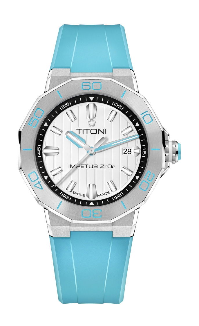 Unveiling a seamless blend of colorful high-tech ceramics, stainless steel, and a rubber strap, this timepiece exudes a daring avant-garde appeal, setting it apart as a true statement piece. The ceramic case ring, adorned with perfectly brushed colors and polished grooves, adds depth and dimension to its powerful aesthetic. Complementing the case, the crown features a ceramic pill, intricately engraved with the TITONI logo, harmoniously mirroring the case ring’s color.
