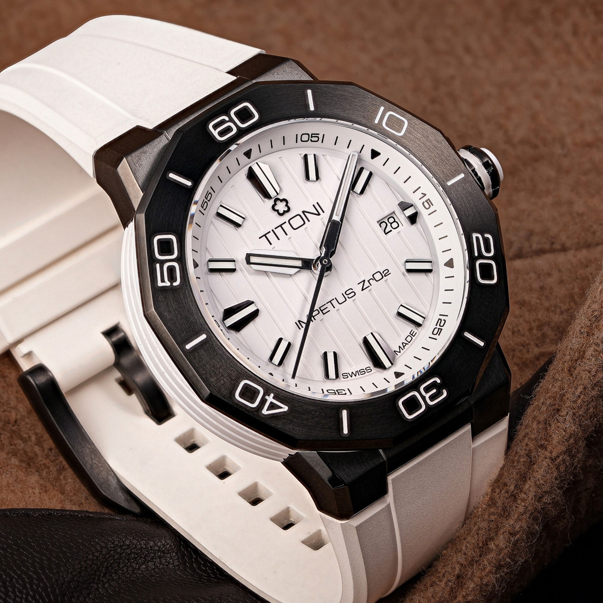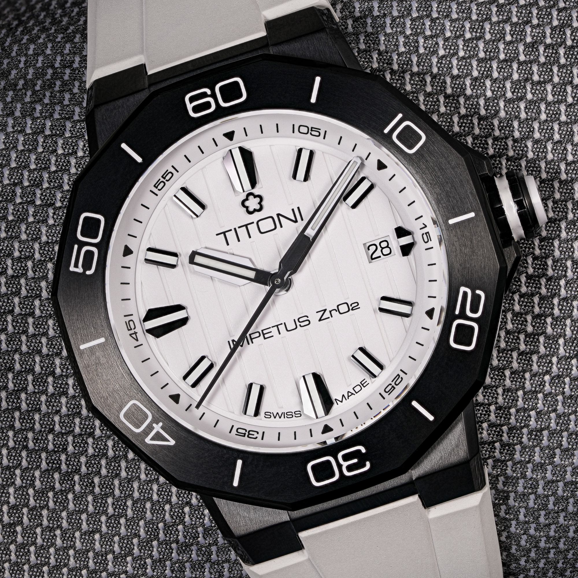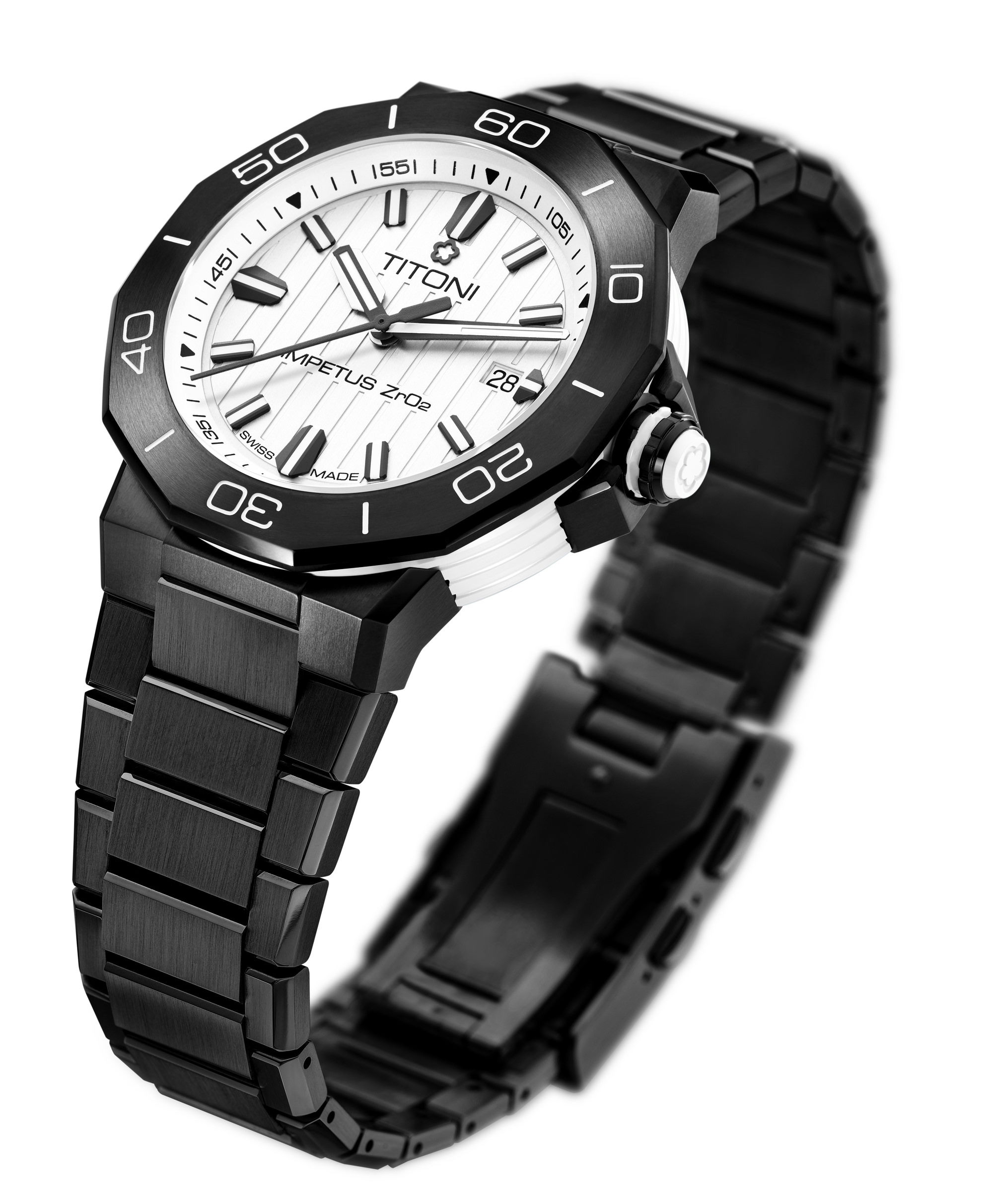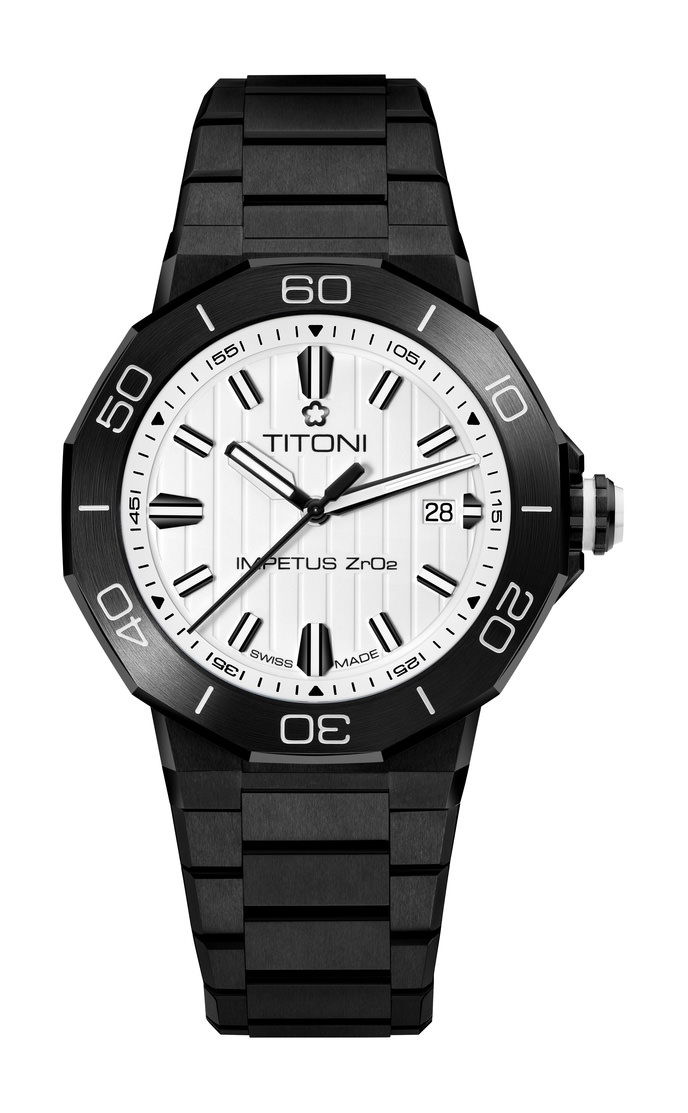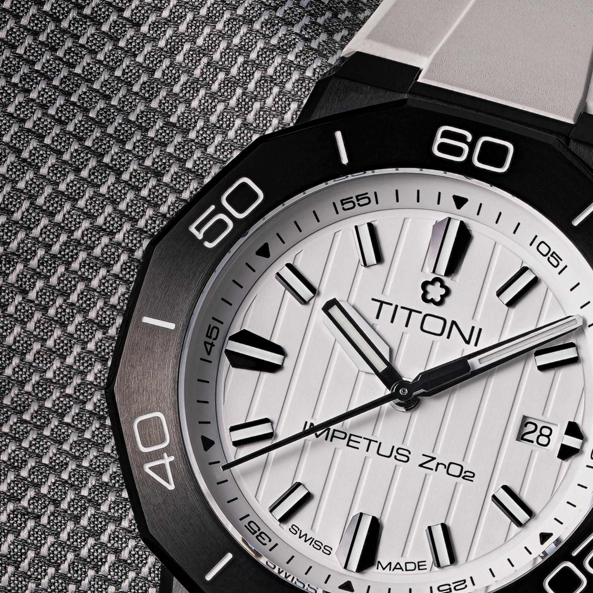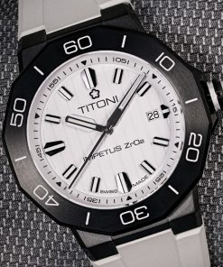 Each watch arrives in a beautifully designed box, complete with an interchangeable rubber strap and a stainless-steel bracelet featuring a single-fold buckle and precision adjustment system. Dive into the world of impeccable design and unmatched durability with the TITONI Impetus CeramTech Watch.