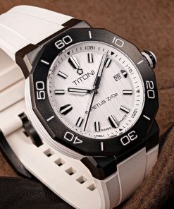 Unveiling a seamless blend of colorful high-tech ceramics, stainless steel, and a rubber strap, this timepiece exudes a daring avant-garde appeal, setting it apart as a true statement piece. The ceramic case ring, adorned with perfectly brushed colors and polished grooves, adds depth and dimension to its powerful aesthetic. Complementing the case, the crown features a ceramic pill, intricately engraved with the TITONI logo, harmoniously mirroring the case ring’s color.