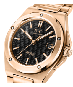 The Ingenieur Automatic 40 features a case and integrated bracelet made of 18-carat 5N gold, a black dial, solid gold appliques and gold-plated hands.