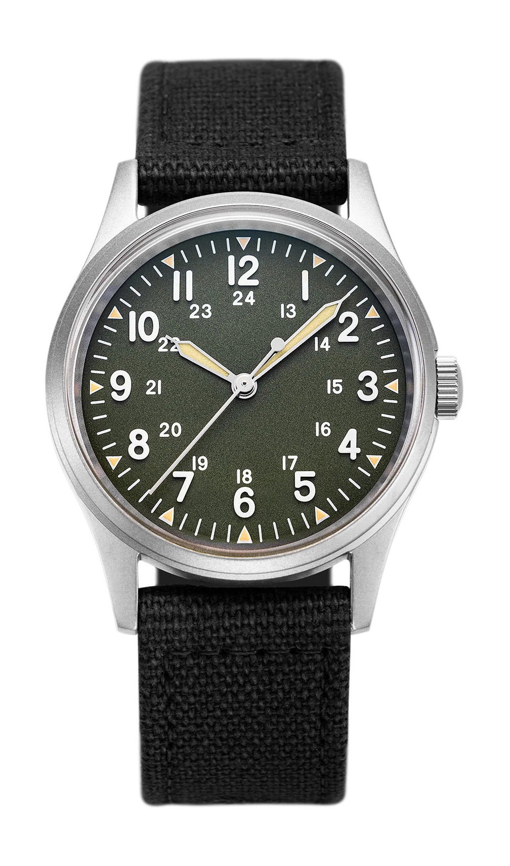 The 34mm size of the Jungle Field watch is a nod to the original 1960s US Military watches, which also had a similar standard diameter. The overall case thickness is less than 10mm to further minimize the watch’s presence on the wrist.
