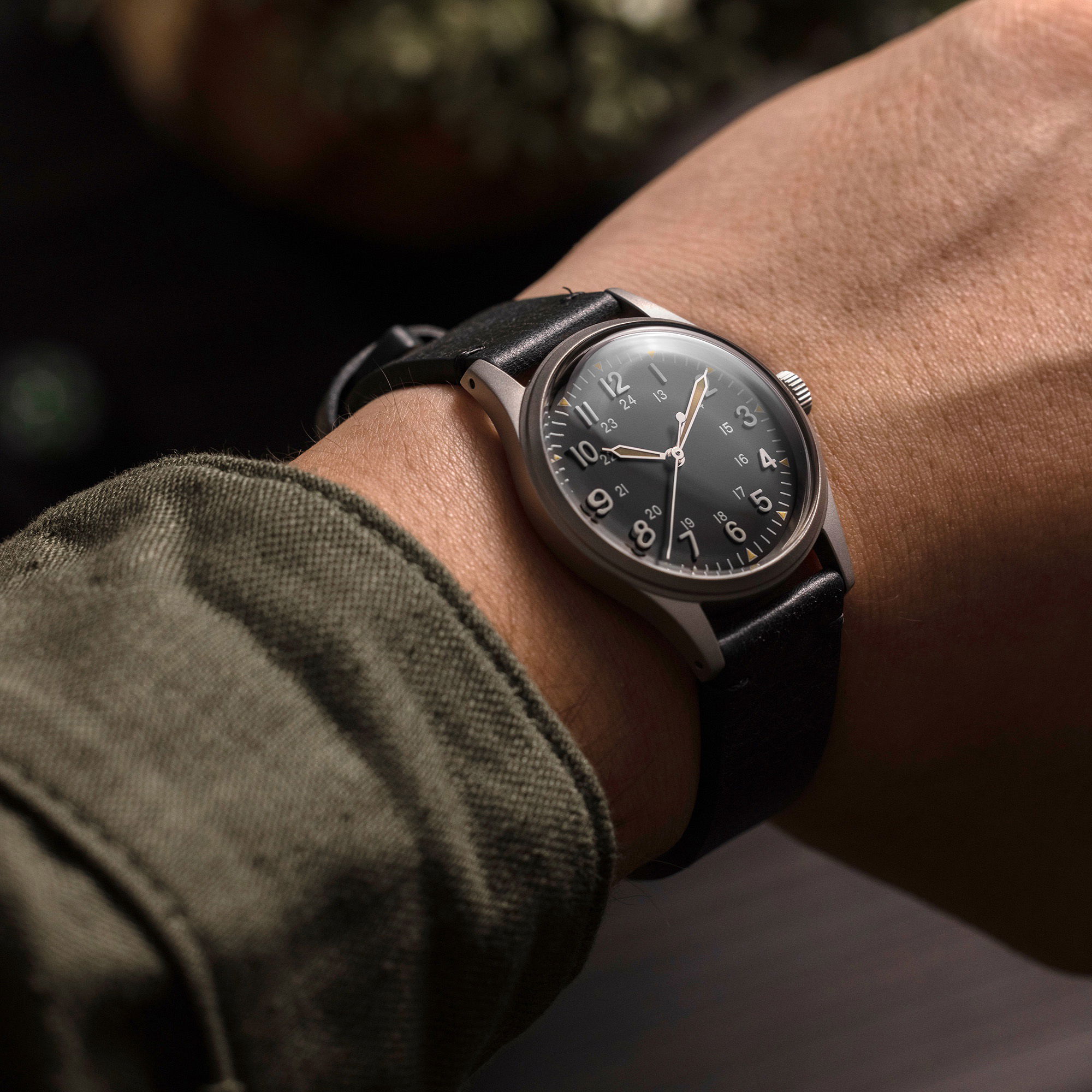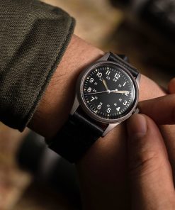 The 34mm size of the Jungle Field watch is a nod to the original 1960s US Military watches, which also had a similar standard diameter. The overall case thickness is less than 10mm to further minimize the watch’s presence on the wrist.