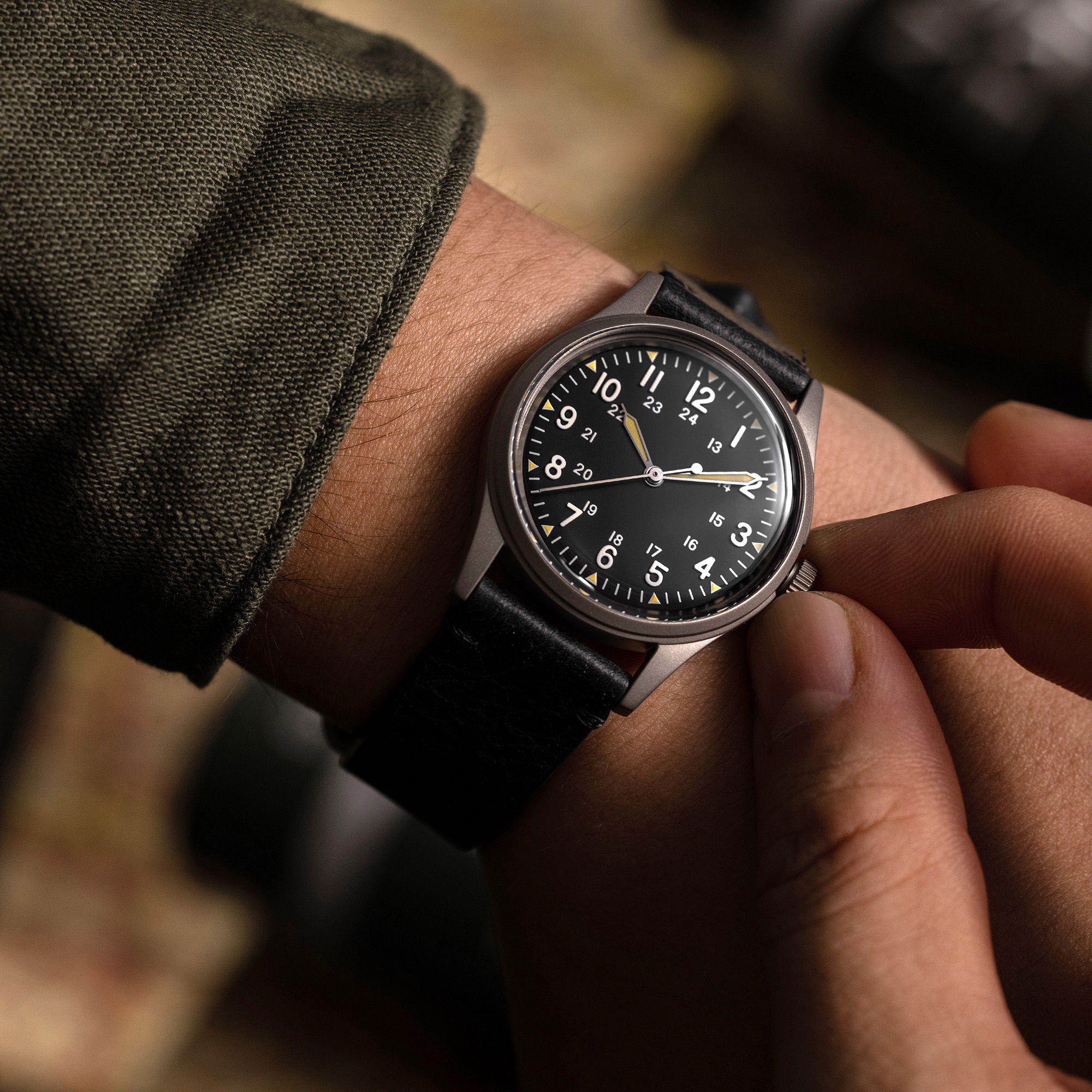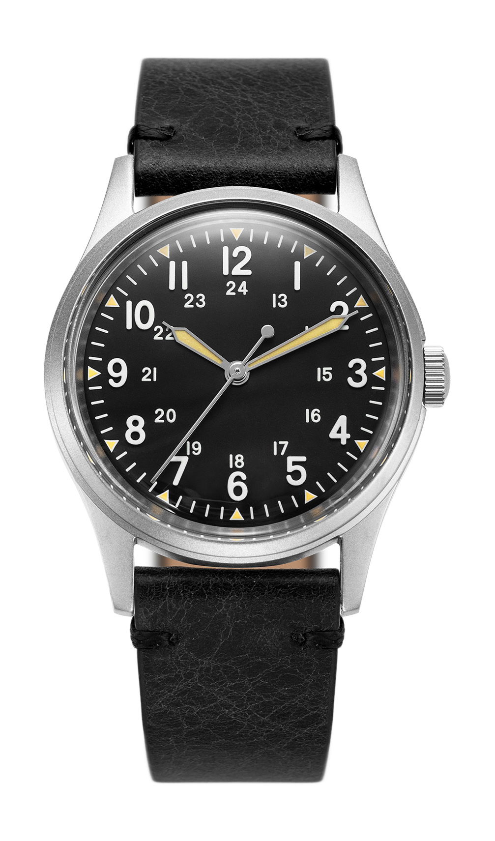 The matte black dial paired with white applied indexes ensures excellent legibility despite the compact 34mm case size. Originally, the GG-W-113 specification mandated that watches be “parkerized” to reduce shine; a similar effect has been achieved here with a thorough sandblasting of the entire case and case back.