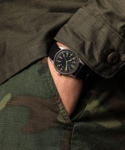 The 34mm size of the Jungle Field watch is a nod to the original 1960s US Military watches, which also had a similar standard diameter. The overall case thickness is less than 10mm to further minimize the watch’s presence on the wrist.