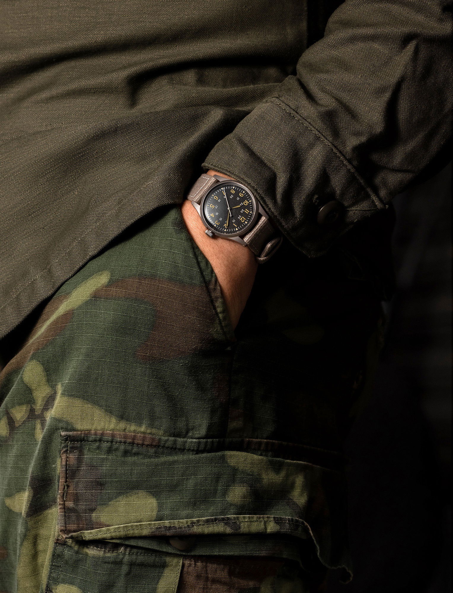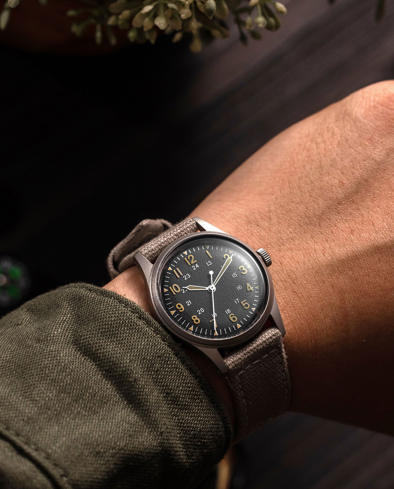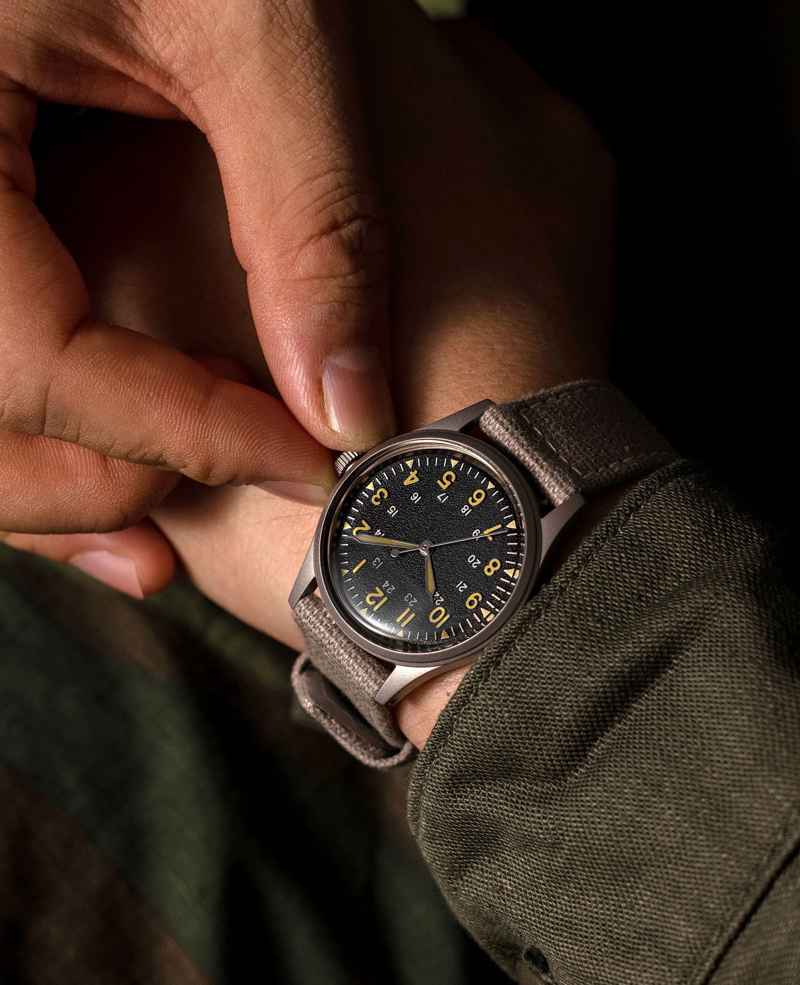 The 34mm size of the Jungle Field watch is a nod to the original 1960s US Military watches, which also had a similar standard diameter. The overall case thickness is less than 10mm to further minimize the watch’s presence on the wrist.