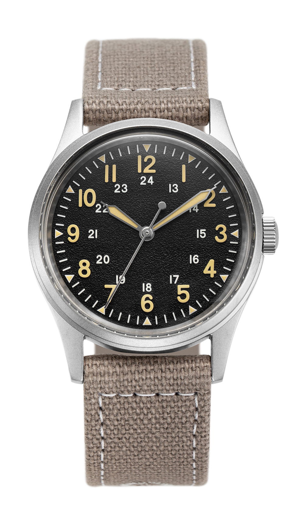 In this more creative interpretation of GG-W-113, the dial is popcorn-textured black dial and features applied patina indexes. Originally, the GG-W-113 specification mandated that watches be “parkerized” to reduce shine; a similar effect has been achieved here with a thorough sandblasting of the entire case and case back.