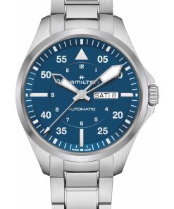 The Khaki Aviation Pilot Day-Date 42 expands on Hamilton’s legacy in aviation, offering a sophisticated balance of tradition and modernity. This series includes three 42 mm references, each featuring the H-30 automatic movement with a substantial 80-hour power reserve and a Nivachron™ balance spring. The day-date window and nickeled hands enhance functionality, while the aesthetics pay homage to the heritage of aviation and outdoor adventure. Choices include a stainless-steel bracelet with a blue dial, light leather with a silver dial, and dark leather with a green dial. These designs are both an ode to the pioneering spirit of early flight and a nod to the rugged, adventurous spirit of the Khaki line, suitable for wear in any setting.
