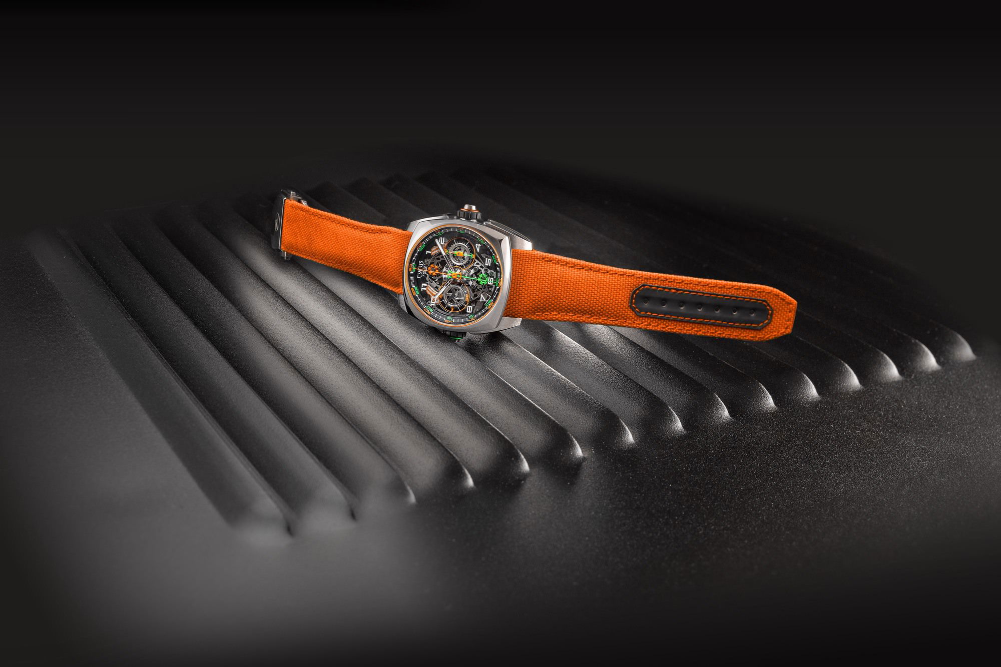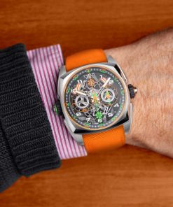 The KLEPCYS DICE SAFFRON is powered by the self-winding CYR718 manufacture movement and features a unique double independent monopusher chronograph. Housed in a 42 mm cushion-shaped case of polished/brushed grade 5 titanium, it offers a choice between an orange Cordura fabric strap and a satin-finished titanium bracelet.