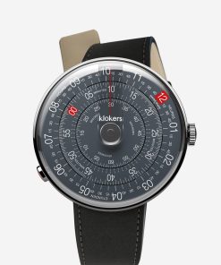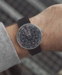 Instead of traditional hands, the KLOK 01 uses three rotating discs—one each for hours, minutes, and seconds—all aligned on the same flat plane and moving counter-clockwise. Time is read along a vertical line at the top of the dial, creating a visually engaging and intuitive way to tell time. It’s a clever nod to the precision tools of the past.