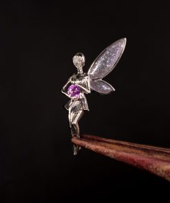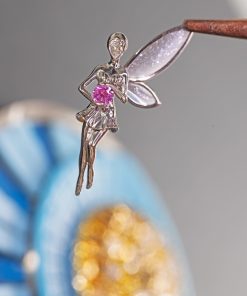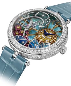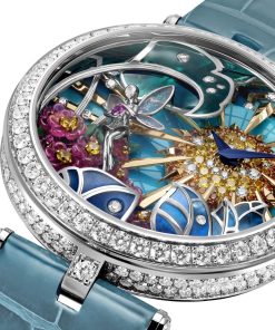 The background showcases a sky with three turquoise shades and a sun made of spessartite garnets, colored sapphires, or diamonds, secured with an innovative lifted setting for a dewdrop-like appearance. The back of the case features an engraved fairy taking flight. This dial took two years and 180 hours to complete.