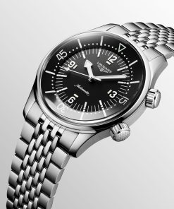 A unique feature is the internal bidirectional rotating bezel for timing dives, safeguarded against accidental adjustments. The Legend Diver’s stainless-steel case combines polished and satin-brushed surfaces and includes a screw-down case back with a diver symbol.