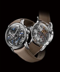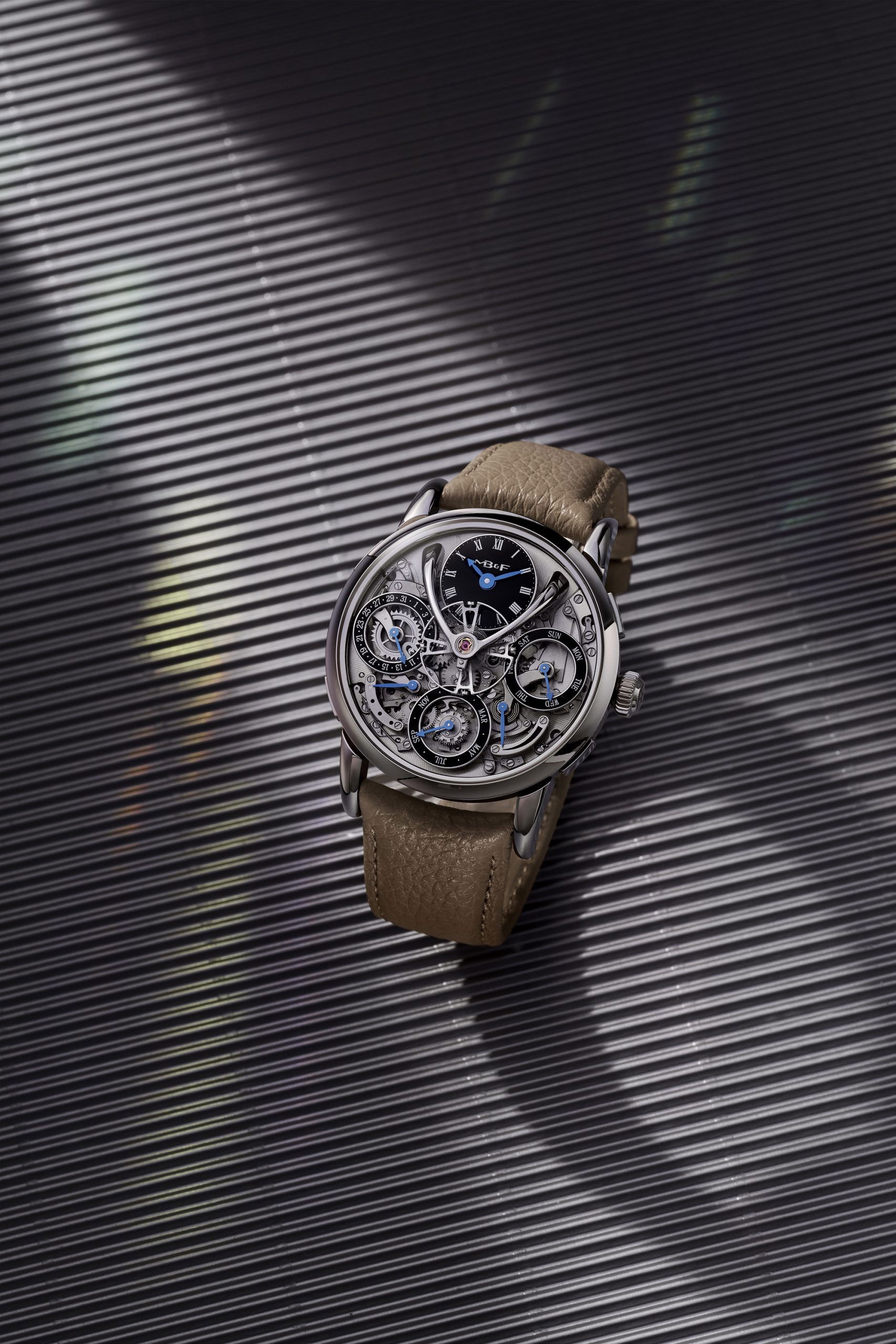 To celebrate its 20th anniversary, MB&F introduces two limited-edition “Longhorns,” each made in stainless steel and limited to 20 pieces. These timepieces feature rhodium-plated base plates, glossy black lacquer dials, and blue hands. The Longhorn concept originated in 2009 during the design process of the LM1, MB&F’s inaugural Legacy Machine. While the idea of extended lugs, or “horns,” was visually striking, it posed a practical challenge—should the spring bar be placed near the case or at the tip of the lugs? Both options risked a poor fit depending on wrist size. Ultimately, shorter horns replaced the long ones, and the idea was set aside.