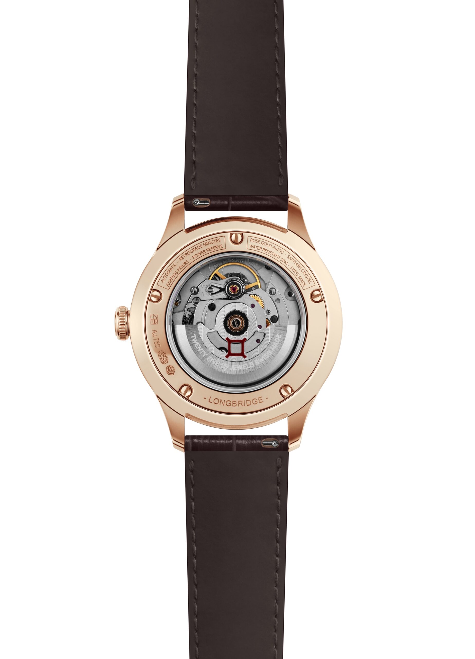 The Longbridge Club Rose Gold, is made from the most precious materials, it boasts an 18-carat rose gold case and a luxurious brown alligator strap, seamlessly blending strength with elegance.