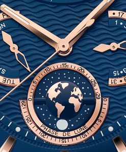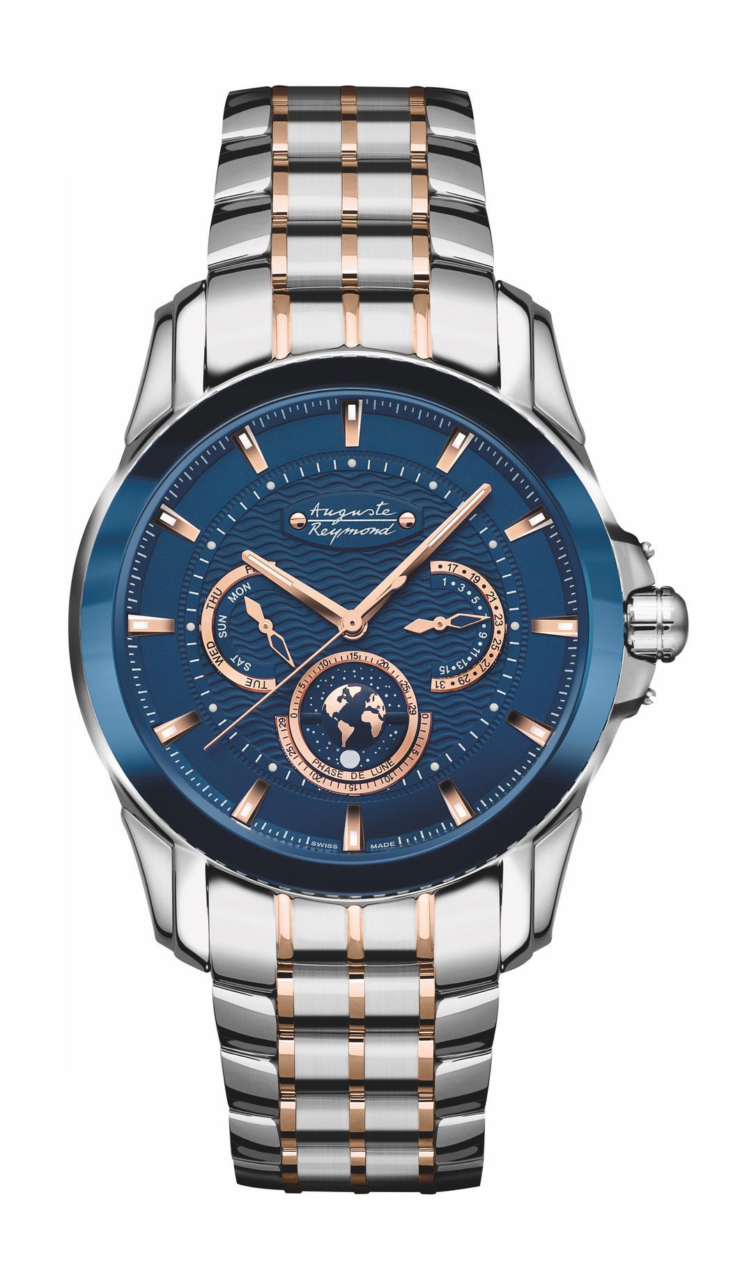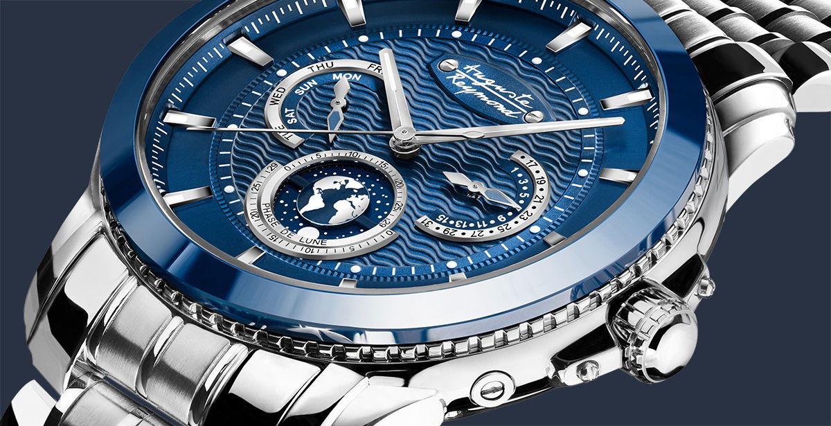 In commemoration of the brand’s 125th Anniversary, the time-honored Auguste Reymond logo is retained, symbolizing the brand’s rich heritage. The Magellan Orbital Moon features a ceramic bezel available in blue or black, housed in a stainless steel case. The face showcases guilloché waves, while the clarity of the day and date is ensured by contrasting sub-dials.