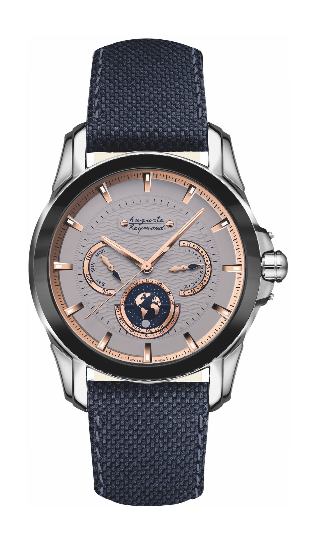 In commemoration of the brand’s 125th Anniversary, the time-honored Auguste Reymond logo is retained, symbolizing the brand’s rich heritage. The Magellan Orbital Moon features a ceramic bezel available in blue or black, housed in a stainless steel case. The face showcases guilloché waves, while the clarity of the day and date is ensured by contrasting sub-dials.