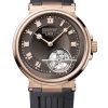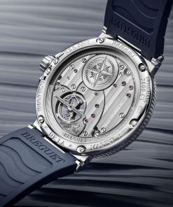 Breguet’s Marine Tourbillon 5577 is a celebration of this historic invention. Nestled within its 42.5 mm platinum case is the self-winding Calibre 581, an impressively slender movement at just 3 mm, constructed from 330 components. This thin profile is achieved by incorporating a peripheral rotor. The balance operates at a frequency of 4 Hertz and boasts an outstanding power reserve of 80 hours. Modern advancements have been integrated into the calibre, such as a carriage and balance spring made of silicon, which is known for its durability and resistance to both wear and magnetic fields. The exquisite craftsmanship of the movement can be admired through the watch’s sapphire case-back, where the barrel drum displays a compass rose.