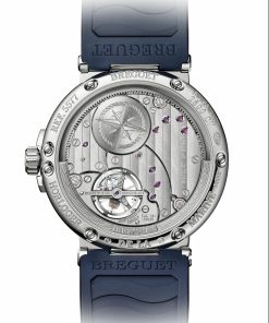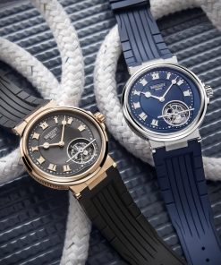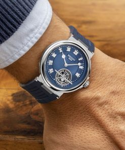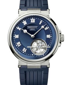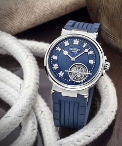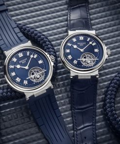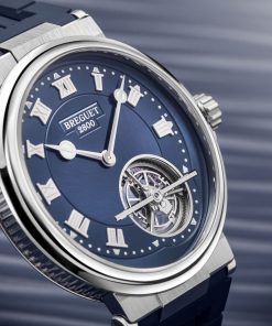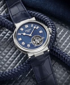 From an aesthetic standpoint, the Marine Tourbillon 5577 showcases a blue sunburst dial. The tourbillon, positioned at 5 o’clock, captivates the observer with its 60-second rotating cage. To emphasize this mechanism, the chapter ring is deliberately off-centered. Furthermore, the hour-markers and the gold Breguet hands are luminescent, ensuring visibility in various lighting conditions.