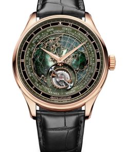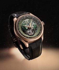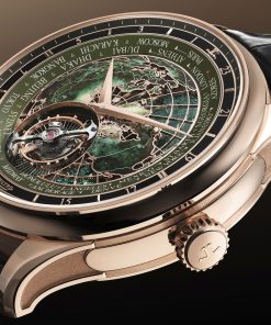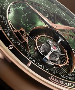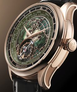 The Jaeger-LeCoultre Master Grande Tradition Calibre 948 World-Timer is a remarkable showcase of the brand’s expertise in watchmaking and complex complications. This model, unveiled in 2024, combines a world time display with a flying tourbillon that completes a circuit around the dial every 24 hours, symbolizing the Earth’s rotation and orbit. It features a green enamel dial crafted in the in-house Métiers RaresTM atelier, set in an 18-carat pink gold case, and is limited to 20 pieces.