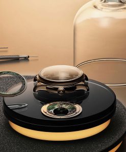 The watch’s design intricately links to the historical concept of world time zones, originating from the need to standardize time across different regions in the 19th century. The dial itself is a piece of art involving over 70 hours of work using techniques like enameling, guillochage, and lacquering. The map on the dial is created with champlevé enamel on a domed gold structure.